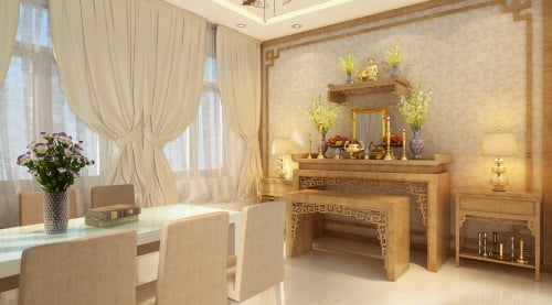 Đối với nhà phố (nhà ống): phòng thờ nên đặt ở tầng trên cùng của căn hộ. Không nên đặt ở phòng khách, vì trong nhà ống thì phòng khách không được thông thoáng, nhang khói không đều và giảm tính tôn nghiêm bàn thờ.