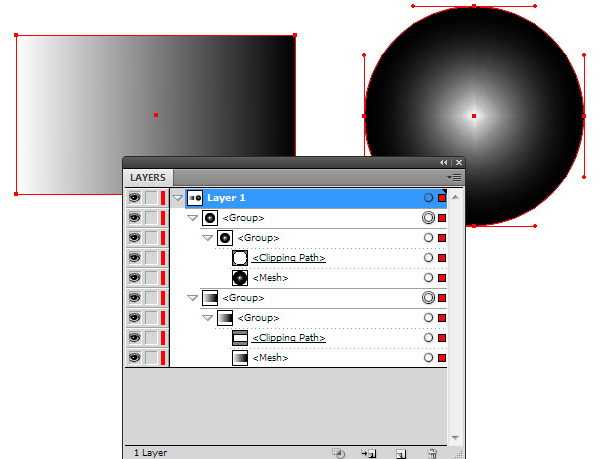 Cách thứ ba để tạo Gradient Mesh đó là chúng ta chuyển đổi từ gradient sang gradient mesh. Chúng ta hãy tạo một hình chữ nhật và một hình tròn được đổ màu bằng linear gradient và radial gradient như hình bên dưới