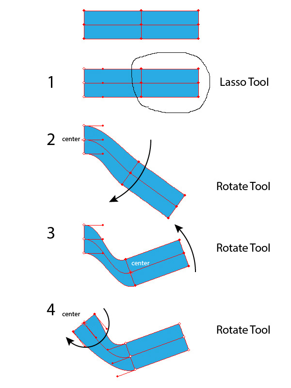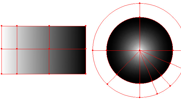 Lúc này bạn sẽ thấy chúng ta có một mạng lưới rất chằng chịt các điểm lưới và đường lưới, rất khó để điều chỉnh cũng như kiểm soát từng cái. Khi chúng ta tạo gradient mesh từ những hình đơn giản như ở phần trên, chúng ta không xảy ra trường hợp rối nùi như thế này. Do đó, để tạo lưới cho những hình dạng phức tạp, chúng ta nên bắt đầu nó bằng hình chữ nhật để kiểm soát cho tốt, đây là một điều hết sức quan trọng. Đồng thời bạn cũng có thể sử dụng các công cụ hỗ trợ cho việc điều chỉnh và chọn các đối tượng điểm lưới và đường lưới bằng công cụ Rotate Tool (R) và Lasso Tool (Q). Trong hình dưới đây, bạn sẽ thấy cách chuyển đổi đường lưới từ hình chữ nhật bằng cách sử dụng những công cụ và phương pháp này :