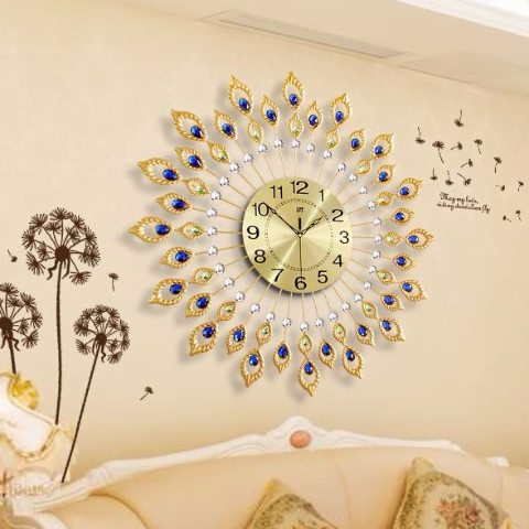 Đồng hồ đính hạt lông công vàng Đồng hồ treo tường đính hạt lông công sắc màu dùng để trang