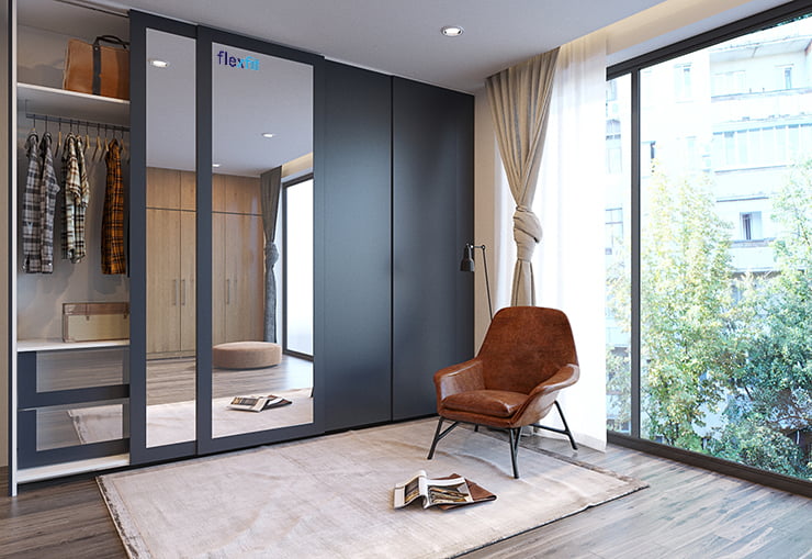 Thiết kế nội thất phòng ngủ 15m2 với mẫu tủ áo đa dạng kiểu dáng. Bạn có thể làm tủ cửa mở, tủ cửa trượt. Trên cánh tủ áo kết hợp gương hoặc kính sẽ giúp cả căn phòng sáng hơn, có chiều sâu và đặc biệt tạo cảm giác rộng rãi