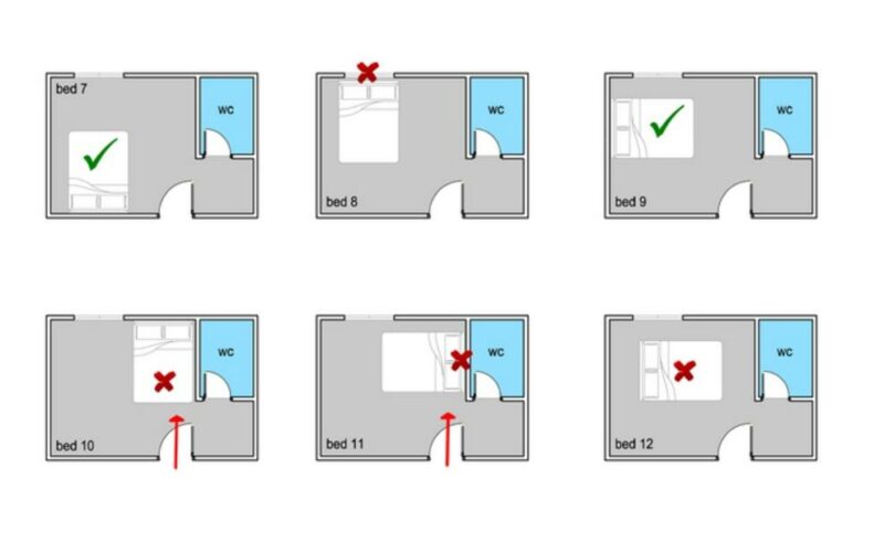 Giường ngủ là nơi để nghỉ ngơi vì thế xét về mặt cảm quan có thể thấy đặt giường đối diện cửa ra vào và cửa sổ thì rất bất tiện.
