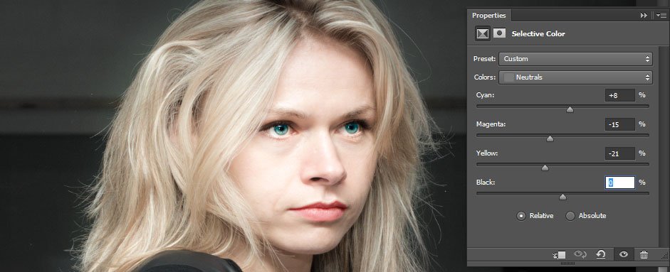 – Với trường hợp này, mình chỉ khuyên các bạn nên sử dụng 3 hệ màu là White, Neutrals và Blacks ở trong bảng Selective Color. Lý do là vì kênh màu trắng sẽ giúp bạn tinh chỉnh những vùng sáng, kênh Neutrals tinh chỉnh vùng trung tính và kênh Blacks tinh chỉnh vùng tối. Không sử dụng các kênh màu khác trong trường hợp này