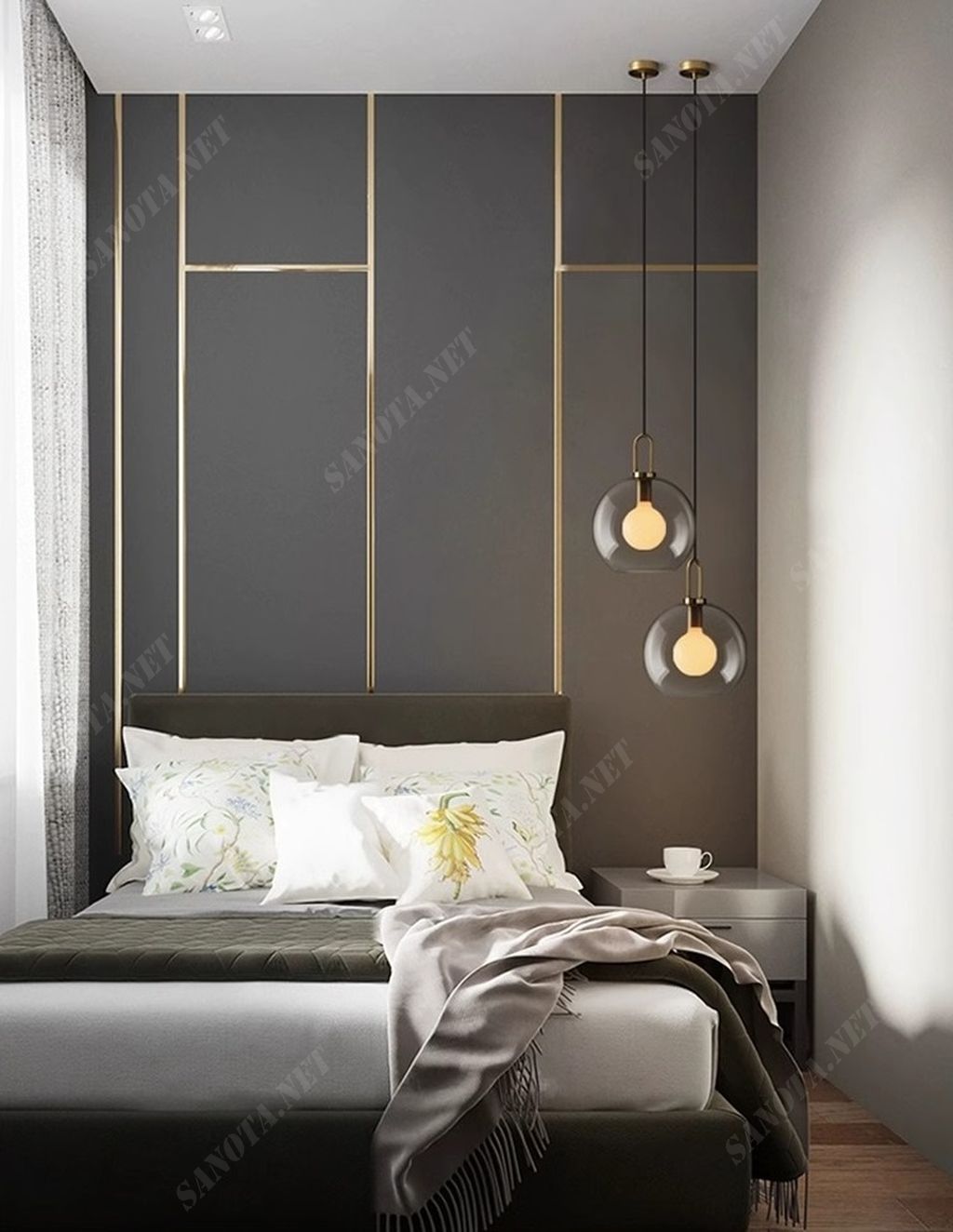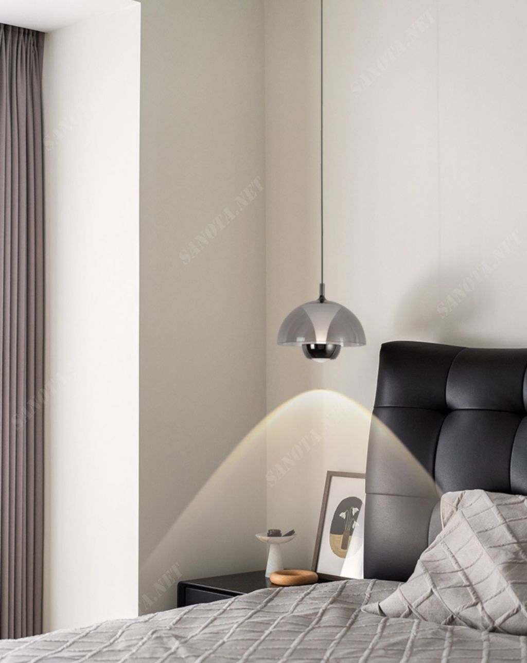 Đèn thả nhỏ gọn cạnh giường ngủ tạo không gian yên tĩnh, thư giãn, lý tưởng cho việc nghỉ ngơi.