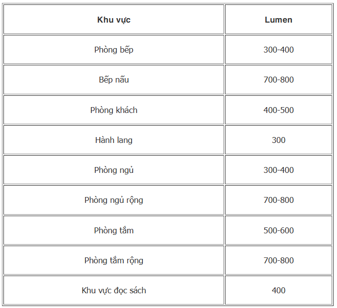 Để chọn đèn phù hợp, bạn cần dựa trên kích thước, chức năng của không gian và nhu cầu chiếu sáng. Dưới đây là bảng tham khảo: