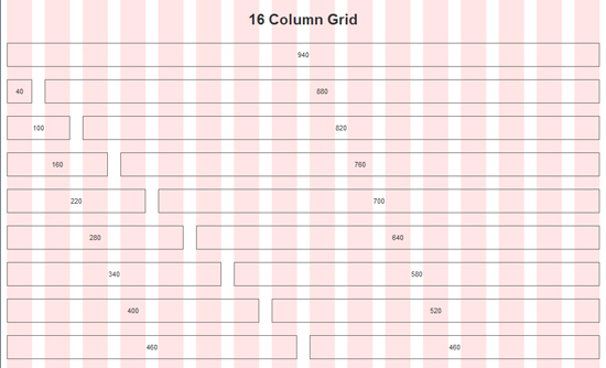 Tương tự, trong hệ thống 16 column, mỗi cột sẽ có độ rộng là 40 px. Ta cũng có thể kết hợp chúng lại như sau :