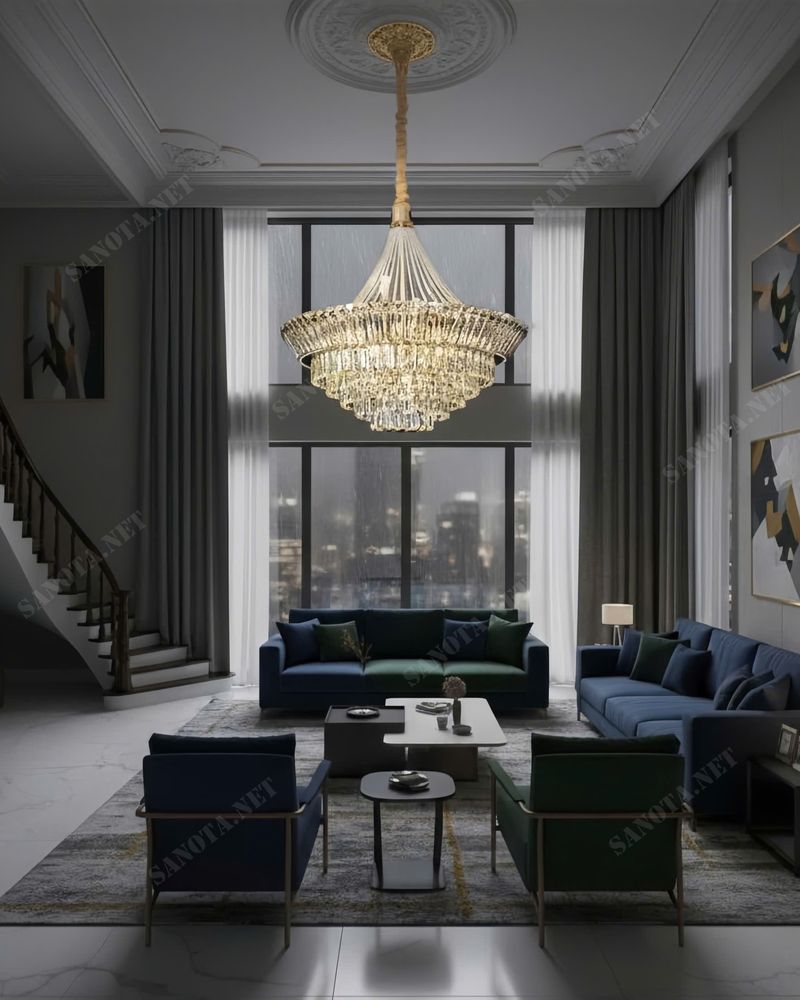Đèn chùm là tuyệt tác ánh sáng, một biểu tượng của sự sang trọng và đẳng cấp cho không gian nội thất. Chiếc đèn chùm này kết hợp hoàn hảo giữa kiểu dáng cổ điển và vẻ đẹp hiện đại. Tạo nên một điểm nhấn thị giác đầy quyền lực. Với thiết kế tinh xảo, nó không chỉ chiếu sáng mà còn biến hóa căn phòng thành một cung điện lộng lẫy, khẳng định gu thẩm mỹ tinh tế của gia chủ.
