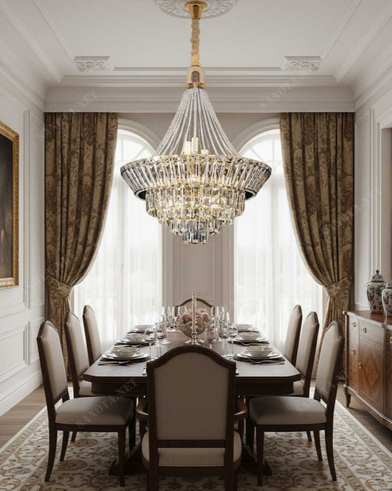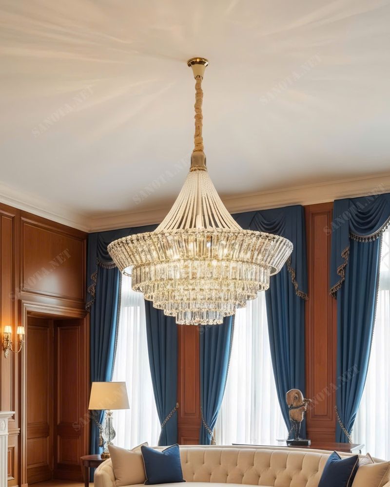 Chiếc đèn chùm nổi bật với cấu trúc phân tầng hoành tráng và đồ sộ. Phần thân đèn có hình dạng bát úp hoặc vương miện mở rộng. Được bao phủ hoàn toàn bởi hàng ngàn hạt pha lê cao cấp. Các hạt pha lê ở phần vành dưới được cắt gọt tinh xảo, mô phỏng hình dáng kim cương (hoặc hình chữ nhật/giọt nước góc cạnh). Tạo hiệu ứng khúc xạ ánh sáng rực rỡ và lấp lánh như một dải ngân hà thu nhỏ khi đèn bật sáng.