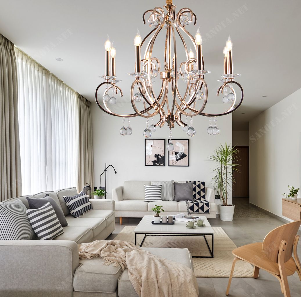 Ngọn nến vàng là điểm nhấn rực rỡ, tỏa ra ánh sáng ấm áp và lãng mạn. Tạo nên không gian ấm cúng và thoải mái. Những giọt pha lê lấp lánh bên trong như những viên ngọc quý. Tăng thêm vẻ lung linh và sang trọng cho chiếc đèn. Bức tranh ánh sáng được tạo ra từ chiếc đèn chùm này là một tác phẩm nghệ thuật, tinh tế và đầy sức hút.