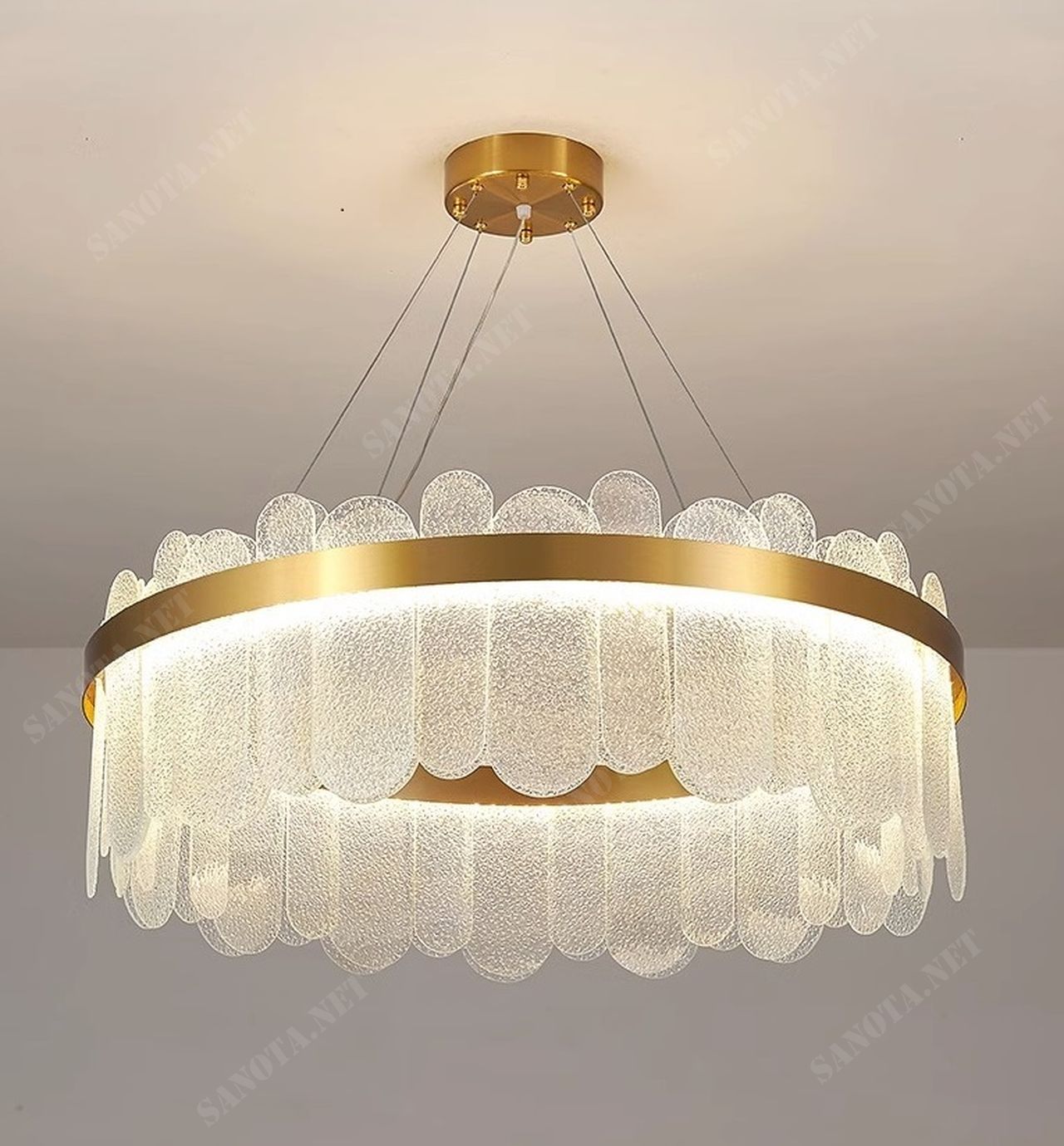 Những đường vân trên chao đèn giống như gợn sóng biển, tạo ra một cảm giác hòa quyện với tự nhiên và biểu tượng cho sự sáng tạo. Thân đèn được làm từ thép không gỉ mạ điện màu vàng, tạo ra sự pha trộn tuyệt vời giữa tính thẩm mỹ và độ bền. Chiếc đèn chùm này thực sự đẹp và lung linh khi được bật đèn, tạo ra một hiệu ứng ánh sáng ấn tượng.