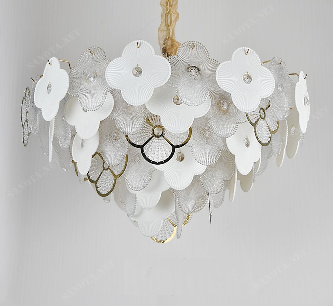 Đèn chùm viền hoa bốn cánh SNT2337 – Chiếc đèn chùm này thực sự là một tác phẩm điêu khắc ánh sáng, mang trong đó vẻ đẹp tinh tế và sự độc đáo của thiết kế. Được hình thành từ những bông hoa bốn cánh pha lê, chiếc đèn chùm tạo nên một hình ảnh tuyệt vời như những đóa hoa rực rỡ đang nở rộ giữa không gian. Chất liệu pha lê trong suốt và pha lê màu trắng xen kẽ nhau, tạo nên một hiệu ứng tuyệt vời về ánh sáng và màu sắc.