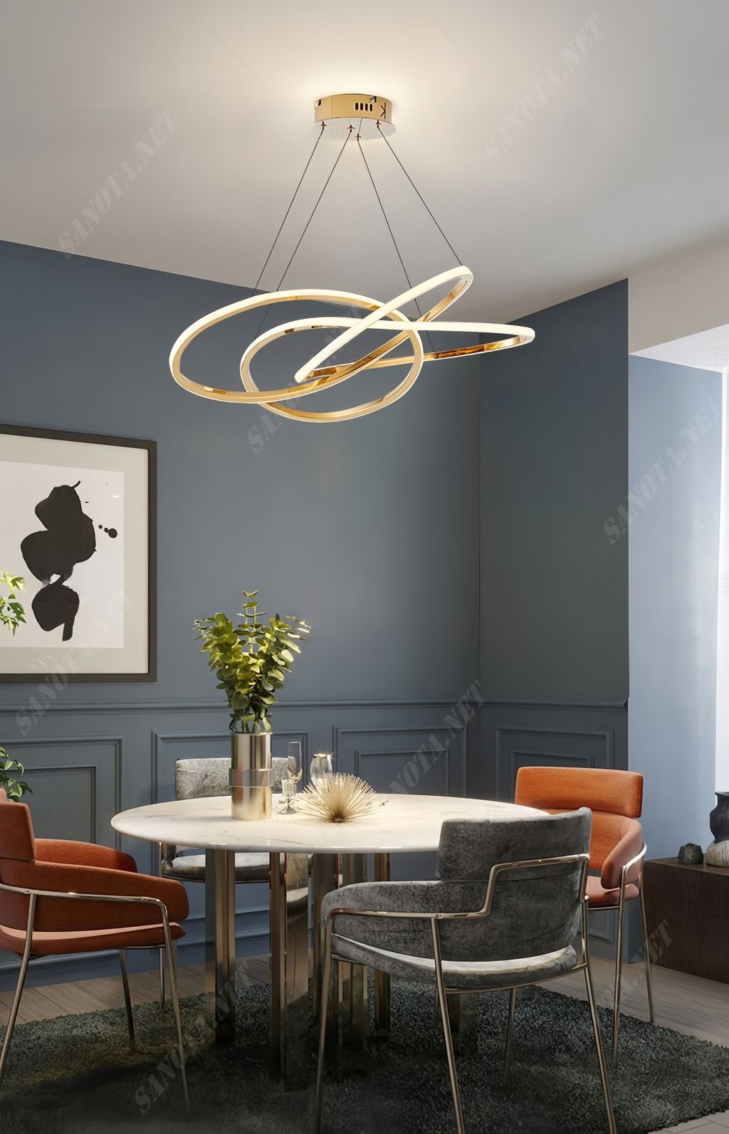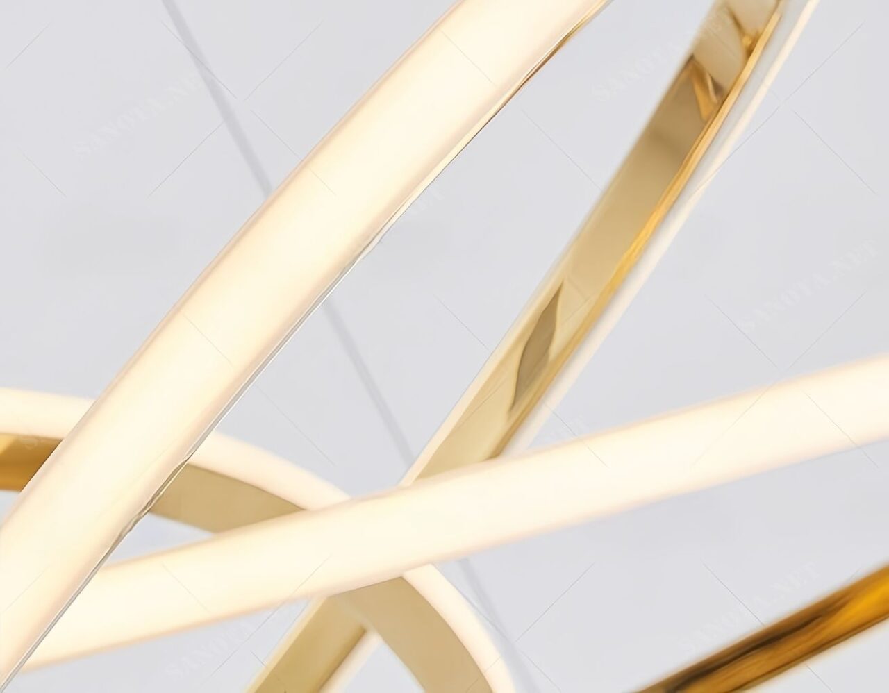một chiếc đèn chùm led với thiết kế hiện đại và sang trọng, là những vòng đèn led uốn lượn một cách mềm mại uyển chuyển tạo cảm giác nhìn ấn tượng, chiếc đèn được làm từ hợp kim xi vàng sáng bóng sang trọng và bền bỉ theo thời gian, sử dụng bóng đèn led chiếc đèn có khả năng chiếu sáng cho cả một không gian, mang lại một không gian ấm áp thoải mái, với các chức năng chiếc đèn có thể đặt ở bất cứ không gian nào sẽ là một món đồ trang trí không thể thiếu trong không gian nội thất