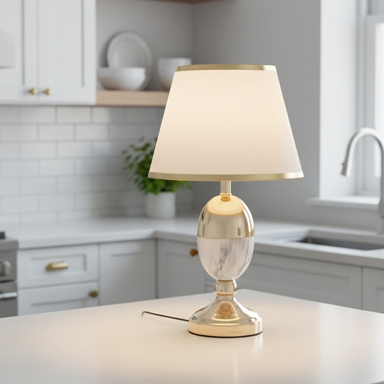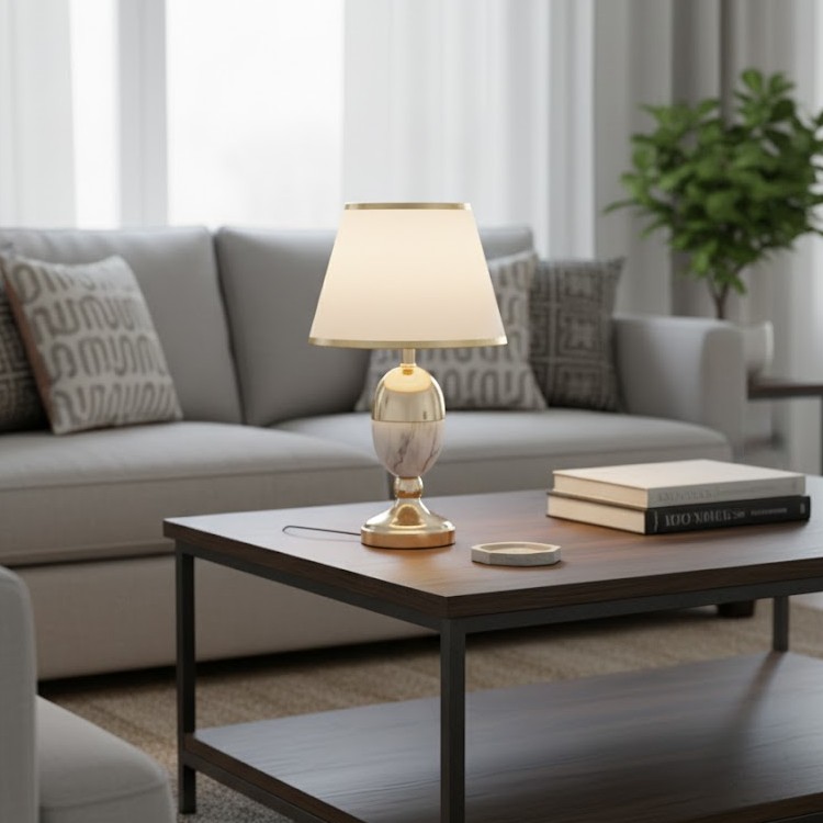 Đèn để bàn chao vải vân đá mang phong cách thiết kế tinh giản nhưng đầy cuốn hút. Đèn để bàn là điểm nhấn hoàn hảo cho không gian sống hiện đại. Với sự kết hợp giữa sắc trắng tinh khôi của chao vải và ánh vàng kim sang trọng của thân đèn. Sản phẩm này không chỉ mang lại ánh sáng ấm áp mà còn tạo cảm giác thanh lịch, đẳng cấp cho mọi căn phòng.