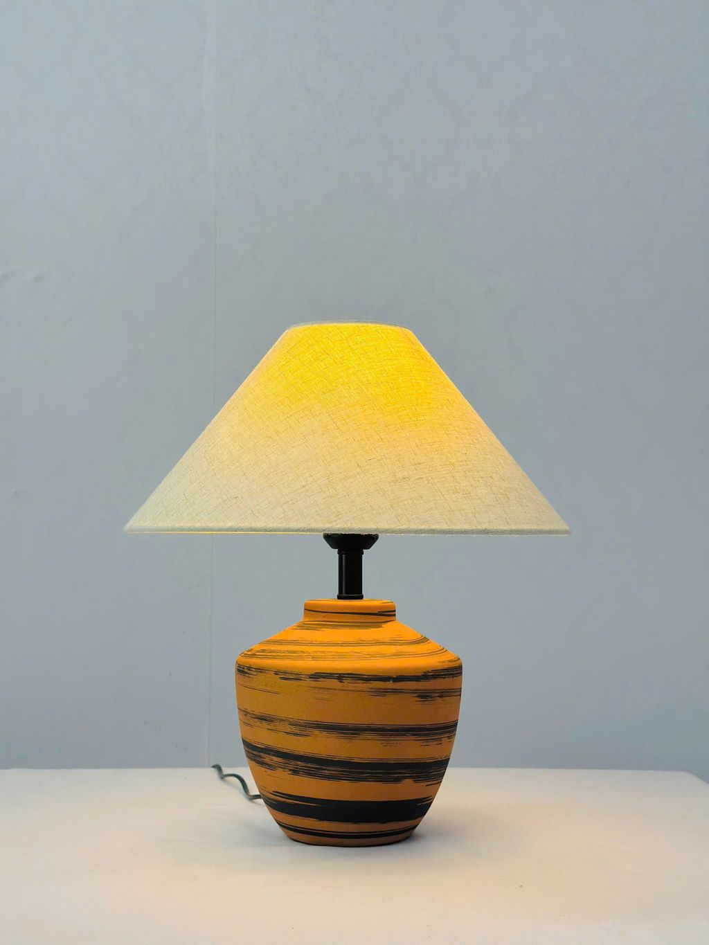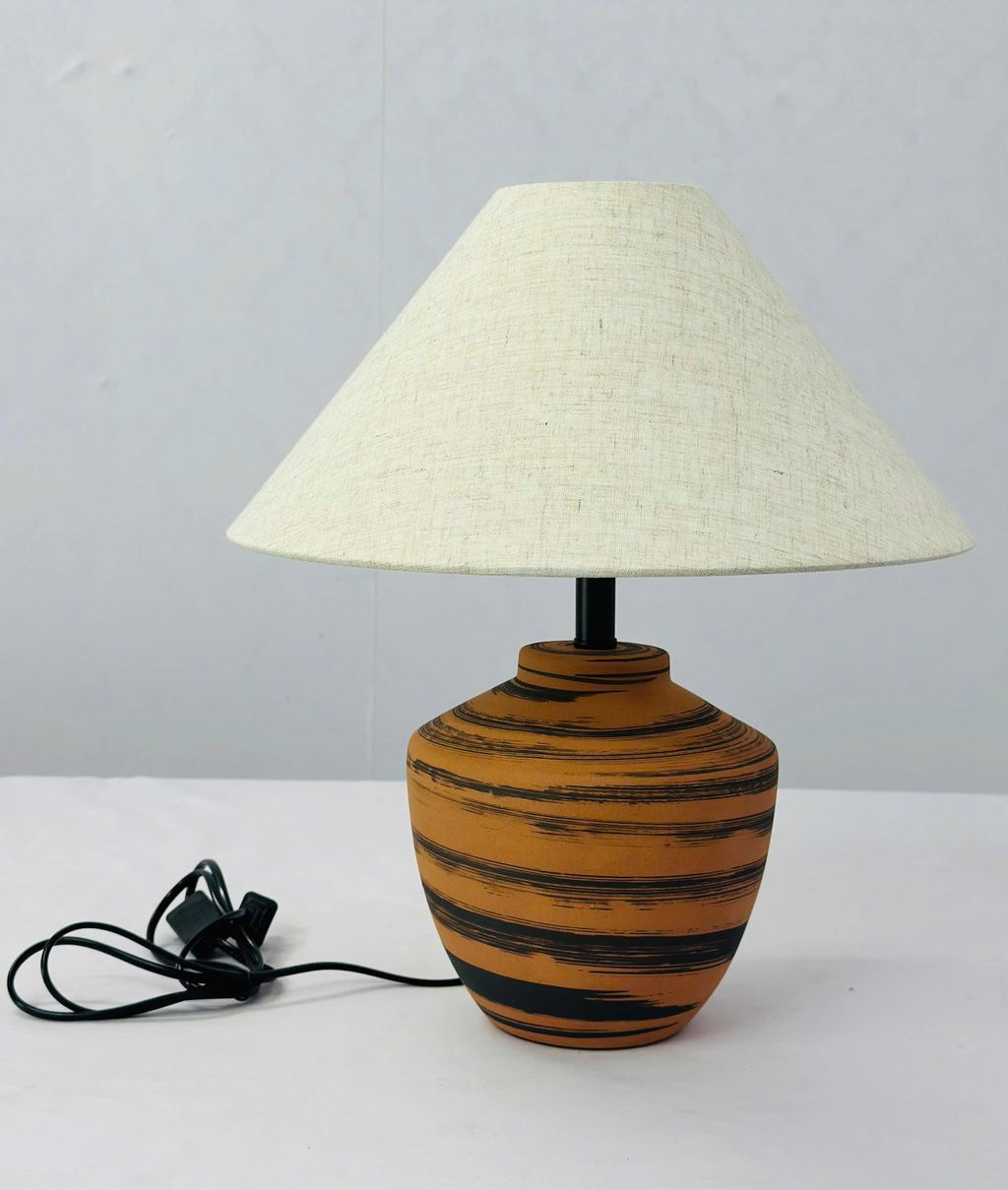 Đèn bàn vân gốm sang trọng với thân đèn được chế tác từ chất liệu gốm sứ cao cấp. Gam màu cam đất phối sọc đen tạo hiệu ứng thị giác mạnh mẽ mà vẫn giữ nét mộc mạc đặc trưng của chất liệu thủ công. Thiết kế này phù hợp với nhiều phong cách nội thất. Từ Scandinavian tối giản, phong cách Nhật trầm lắng đến không gian hiện đại đương đại.