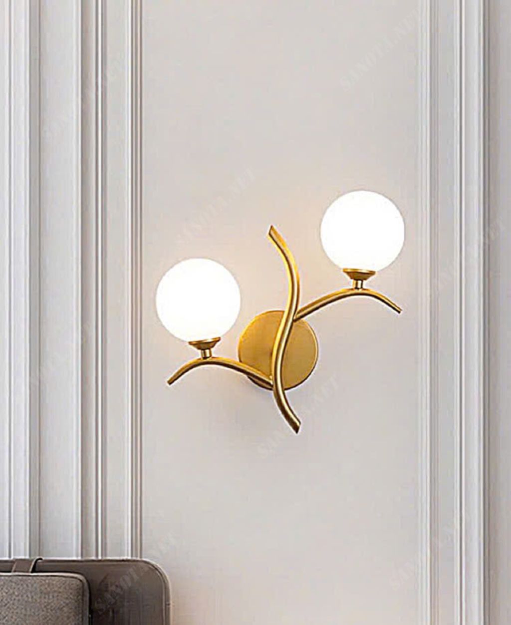Đèn gắn tường được thiết kế với hai quả cầu. Đối xứng nhau trên một khung kim loại chắc chắn. Hai quả cầu này như hai ngôi sao lấp lánh, tạo ra ánh sáng mềm mại và dịu nhẹ.