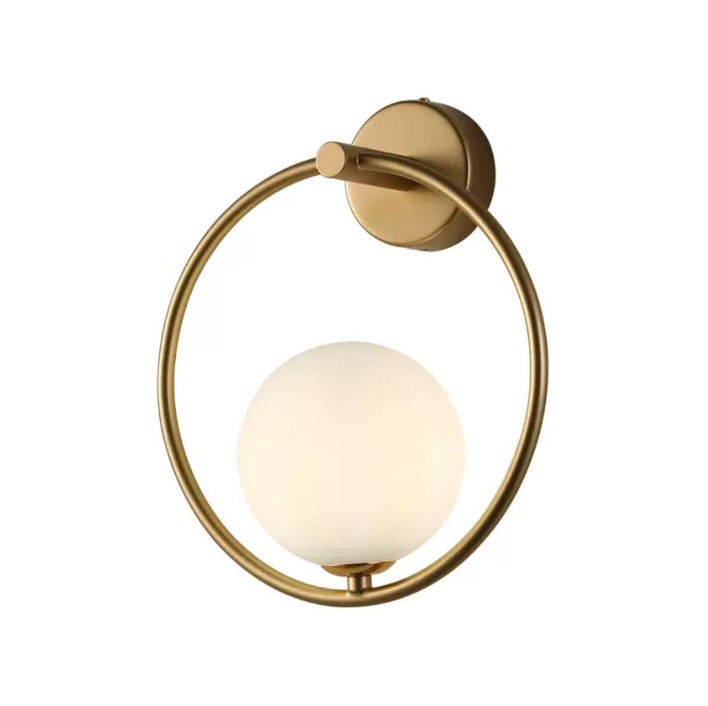 Chiếc đèn có thiết kế là một hình vòng tròn mảnh khảnh. Có chất liệu sắt sơn tĩnh điện mạ vàng, chắc chắn và độ bền cao. Điểm độc đáo của chiếc đèn là quả cầu thuỷ tinh đặt bên trong vòng tròn. Như một viên trân châu quý phái đang toả sáng.
