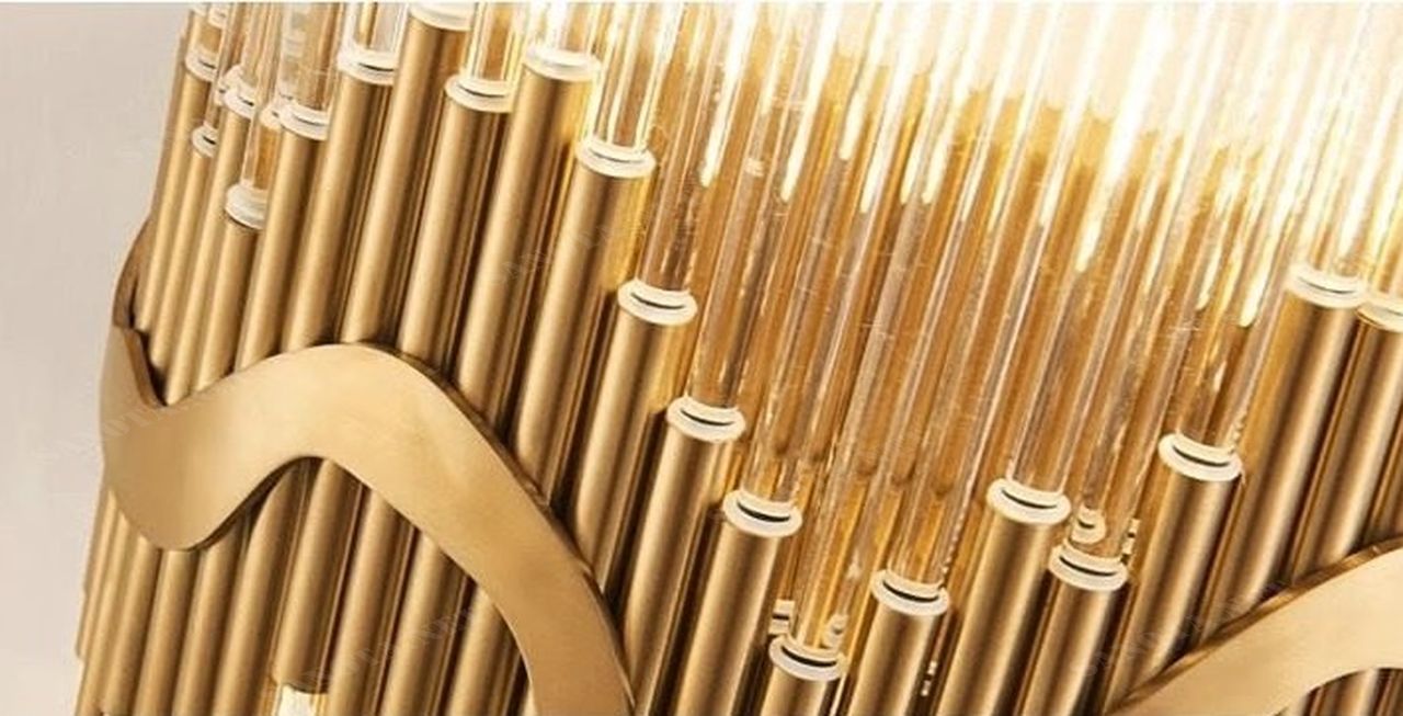 Đèn gắn tường thanh thuỷ tinh ốp vàng SNT2360 – Chiếc đèn gắn tường này là một tác phẩm nghệ thuật ánh sáng đầy quyến rũ, với thiết kế tinh tế và sang trọng. Những ống thuỷ tinh trong suốt được sắp xếp một cách khéo léo, tạo nên một cấu trúc độc đáo và thu hút. Mỗi chiếc ống thủy tinh như là một viên ngọc quý, tạo ra các tầng lớp ánh sáng và bóng đổ đa dạng khi ánh đèn được bật.