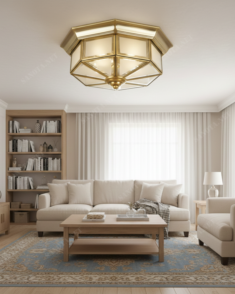 Chiếc đèn ốp trần có hình dáng tổng thể là khối bát giác độc đáo. Được thiết kế để ốp sát trần nhà. Toàn bộ khung đèn được chế tác từ đồng, mang lại màu sắc vàng ánh kim cổ kính và độ bền vượt trội theo thời gian.