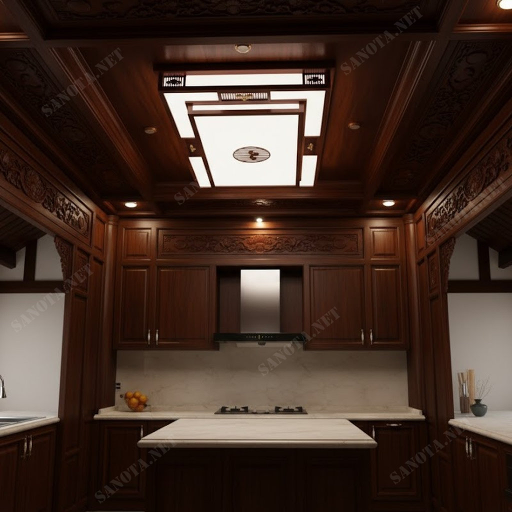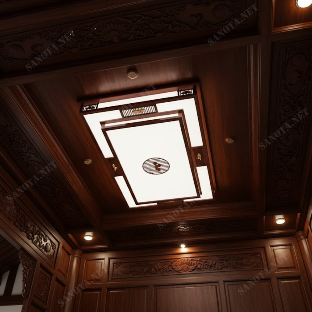 Đèn ốp trần cổ điển mang lại cảm giác ấm áp, gần gũi và sang trọng nhờ khung gỗ màu nâu đậm cổ điển. Màu sắc này dễ dàng kết hợp hài hòa với nội thất gỗ truyền thống, phong cách Á Đông.