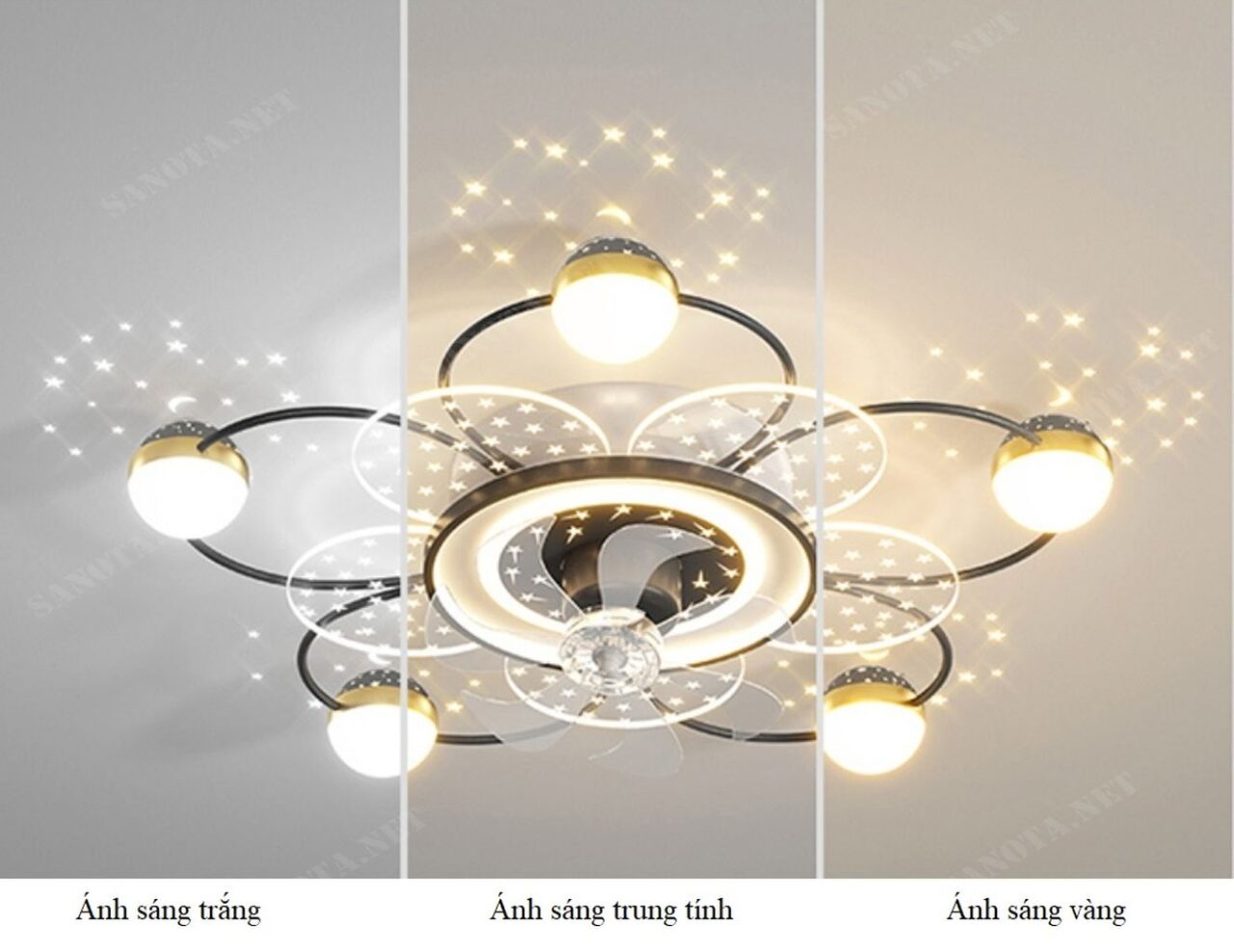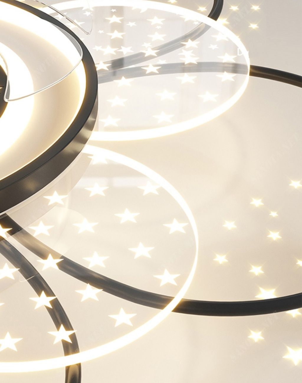 một chiếc đèn ốp trần hiện đại kết hợp với đó là quạt trần, với thiết kế là những vòng tròn kết hợp thành một bông hoa dưới ánh sáng của mâm đèn led cùng với đó là những bóng đèn tạo hiệu ứng ngôi sao trên mỗi vòng tròn. Khi chiếc đèn được bật là lúc chiếc đèn nổi bật giữa không gian nội thất, ánh sáng nổi bật, đủ chiếu sáng cho cả một không gian của bóng đèn led, và hình ảnh những ngôi sao sáng lấp lánh trên trần nhà từ bóng đèn tạo hiệu ứng, lung linh thơ mộng, đặc biệt là sự đa công năng của chiếc đèn khi kết hợp với quạt trần, vừa là chiếc đèn chiếu sáng vừa là chiếc quạt đem lại sự mát mẻ cho căn phòng, một chiếc đèn led kết hợp quạt tiện dụng có thể đặt ở bất kì nơi đâu, phòng khách hiện đại, phòng ngủ ấm áp
