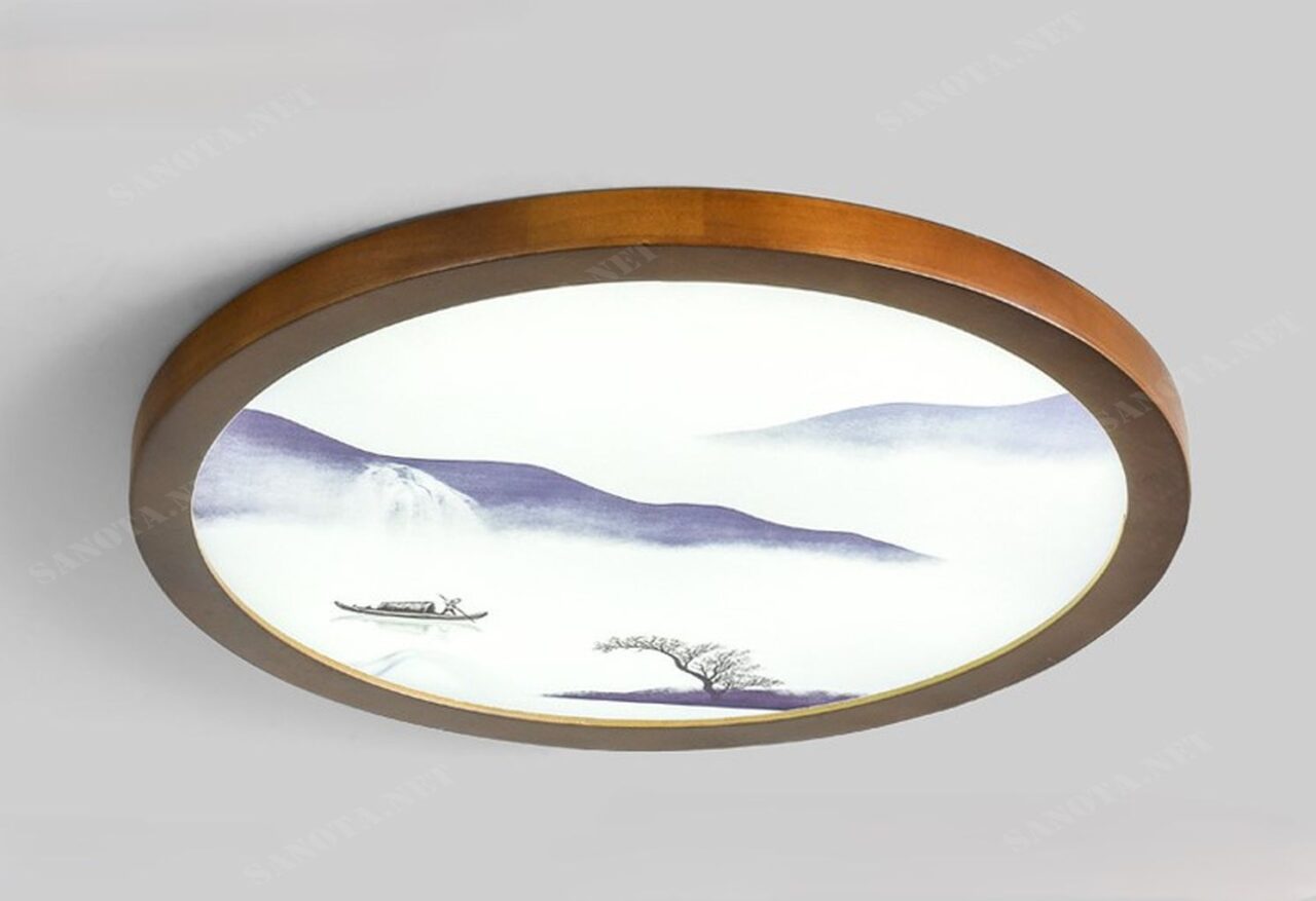 Đèn ốp trần kết hợp với tranh phong cảnh sẽ làm cho không gian sống của bạn trở nên yên bình, gần gũi với thiên nhiên. Loại đèn này được thiết kết với viền gỗ màu nâu ấp ám. Hãy xem qua những đặc điểm, hình dạng của chiếc đèn ở đoạn văn dưới đây nhé!