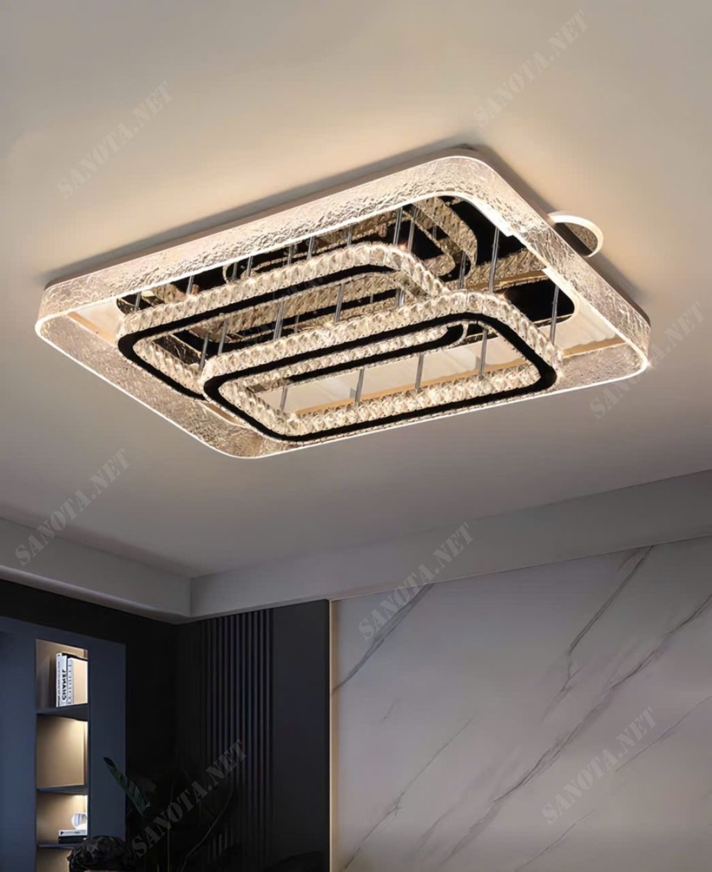 Chiếc đèn ốp trần pha lê được tạo hình từ hai khung chữ nhật lồng ghép vào nhau – một bố cục vừa cân đối vừa hiện đại. Mỗi khung đều được đính pha lê trong suốt tinh xảo. Giúp ánh sáng khi phản chiếu trở nên rực rỡ và lung linh như dải ánh kim huyền ảo. Khi bật sáng, toàn bộ không gian được bao phủ bởi lớp ánh sáng dịu, sang, và đầy chiều sâu.