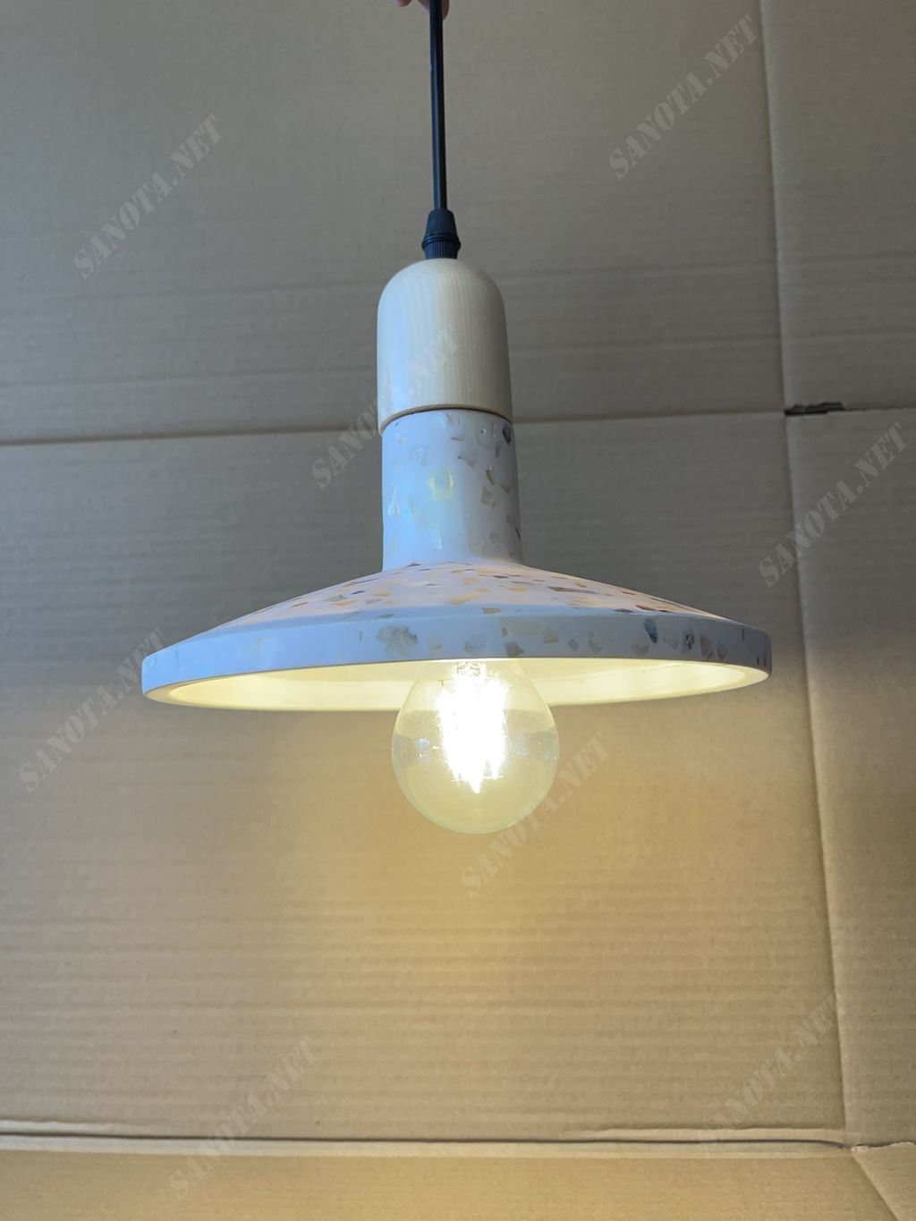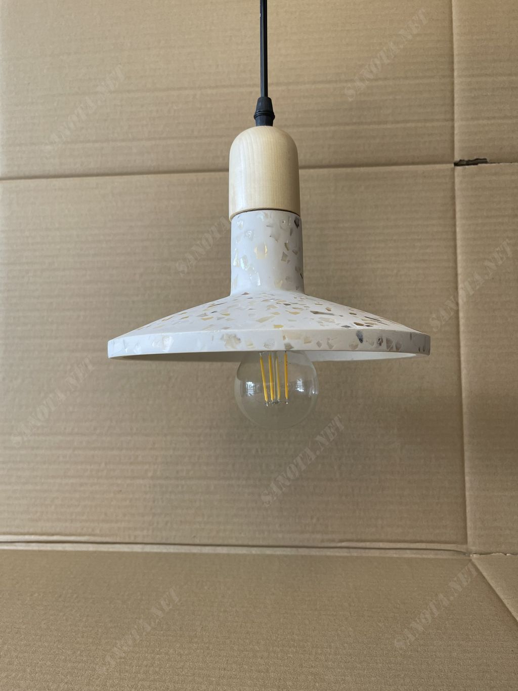 Một chiếc đèn thả chế tác thủ công từ chất liệu bê tông đá mài sợi khảm xà cừ cao cấp. Hay còn được biết đến với tên gọi đèn đá mài Terrazzo, đèn xi măng, hoặc đèn đá mài Composite.