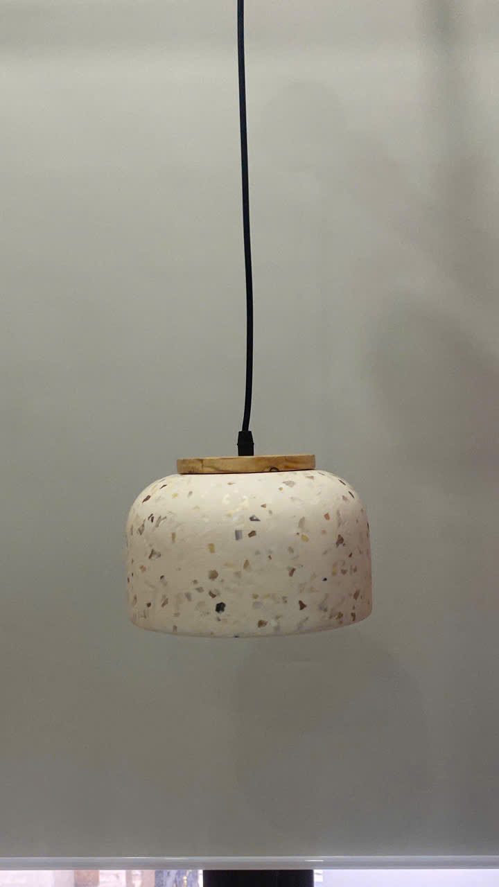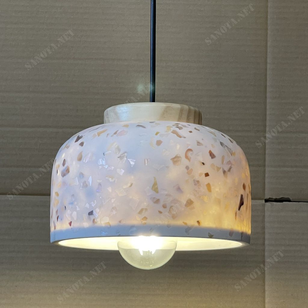 Một chiếc đèn thả chế tác thủ công từ chất liệu bê tông đá mài sợi khảm xà cừ cao cấp. Hay còn được biết đến với tên gọi đèn đá mài Terrazzo, đèn xi măng, hoặc đèn đá mài Composite.