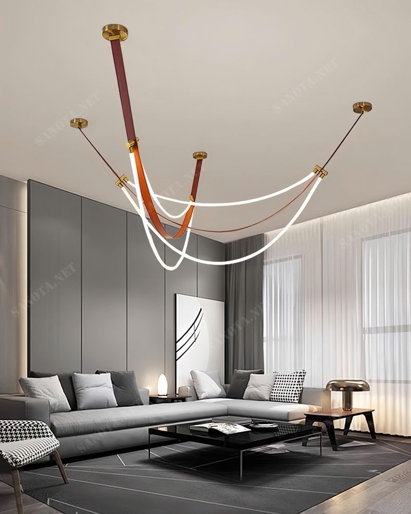 Đèn thả thông tầng nổi bật với cấu trúc treo trần lạ mắt. Mô phỏng hình ảnh những chiếc dây đai được uốn cong duyên dáng và cố định bằng các chi tiết kim loại mạ đồng sáng bóng. Điểm nhấn chính là những thanh đèn LED linh hoạt được tích hợp khéo léo chạy dọc theo các đường cong. Tạo ra hiệu ứng ánh sáng lan tỏa nhẹ nhàng.