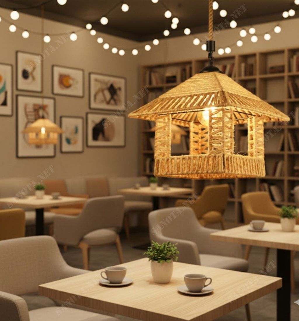 Đèn thả dây thừng đan tay hình ngôi nhà mang đậm nét phong cách mộc mạc và ấm cúng. Thân đèn được làm từ dây thừng tự nhiên đan thủ công tỉ mỉ, tạo hình dáng ngôi nhà độc đáo, vừa là nguồn sáng vừa là điểm nhấn trang trí tinh tế. Ánh sáng từ bóng đèn được tỏa ra qua các khe hở của lớp đan, tạo hiệu ứng ánh sáng mềm mại và ấm áp, thích hợp cho phòng khách, phòng ngủ hay góc đọc sách.