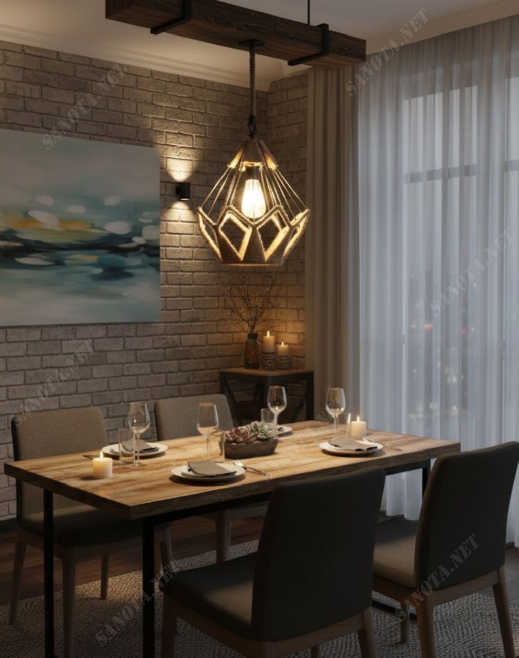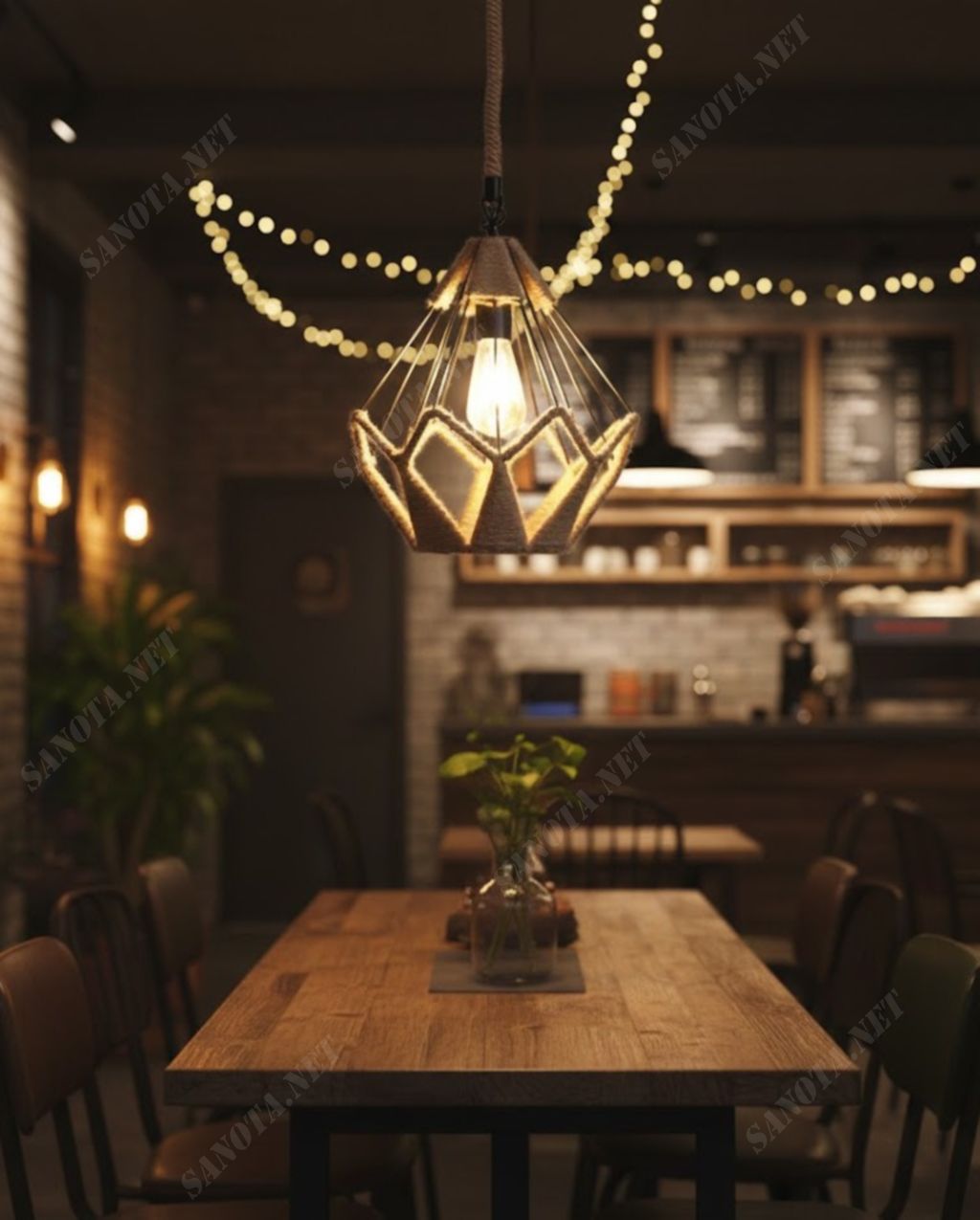 Đèn thả dây thừng hình thoi trong ảnh gây ấn tượng với thiết kế độc đáo, kết hợp đường nét hình học và chất liệu dây thừng tự nhiên. Phần chao đèn được tạo hình khối thoi mở, đan từ dây thừng chắc chắn. Mang đến vẻ đẹp mộc mạc nhưng vẫn tinh tế và đầy tính nghệ thuật. Kiểu đan mở giúp ánh sáng lan tỏa đều, tạo nên những đường bóng đổ đẹp mắt trên bàn ăn và tường. Mang lại cảm giác ấm áp và gần gũi.