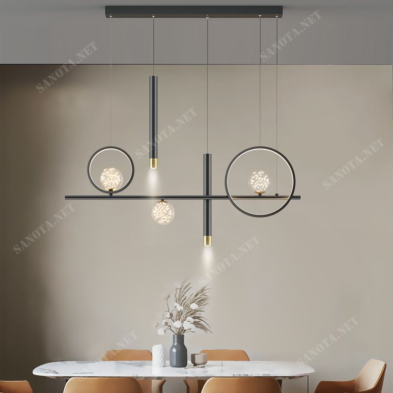 Chiếc đèn chùm này có một thanh đèn LED nằm ngang, tạo ra một đường thẳng sáng bên trên. Hai vòng tròn tương phản ở hai bên đèn chùm là điểm nhấn quyến rũ. Bên trong những vòng tròn tinh tế ấy, có hai bóng đèn thuỷ tinh lấp lánh, tạo nên ánh sáng mềm mịn và màu sắc đa dạng, đang chờ đợi để làm loá sáng không gian xung quanh.