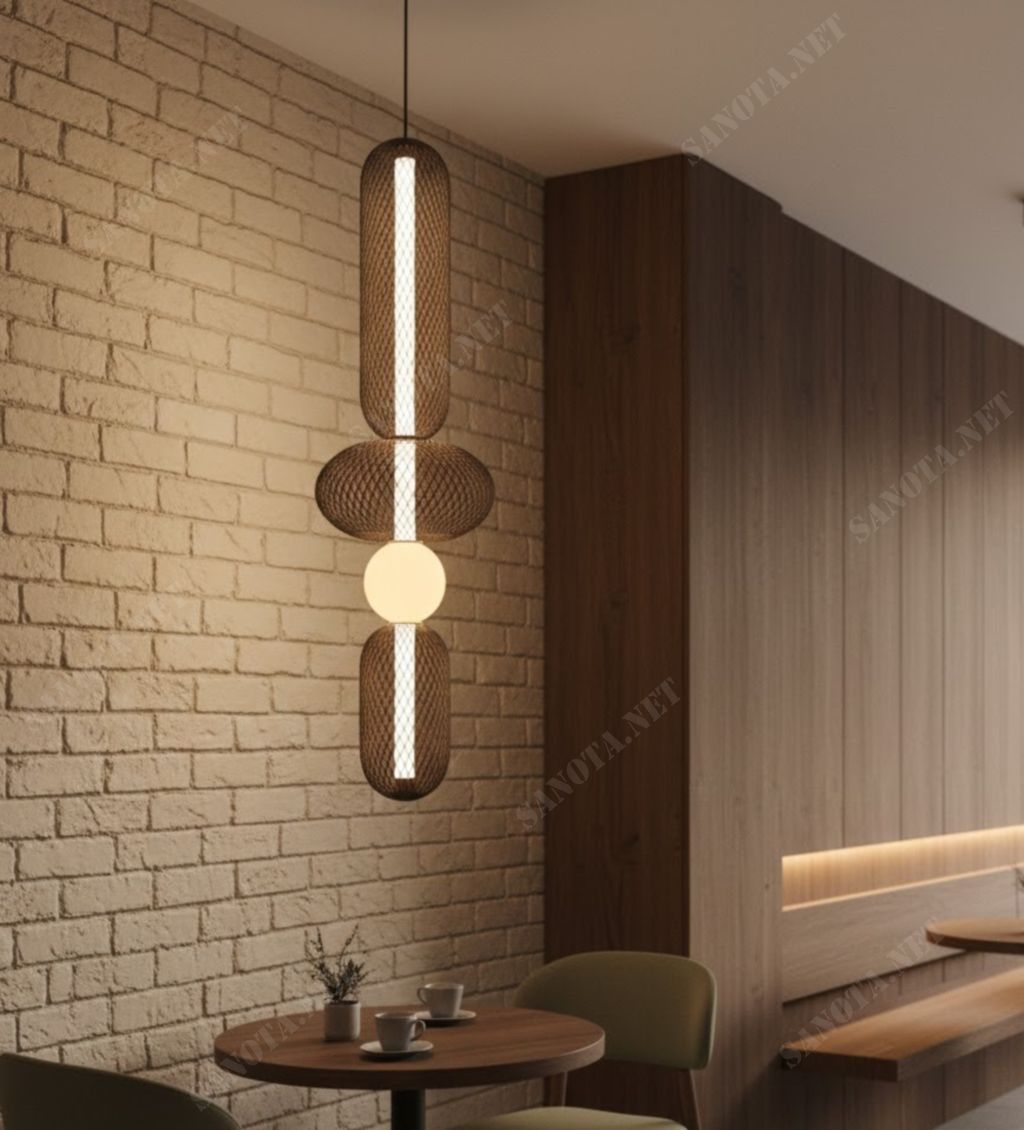 Đèn thả lưới đa tầng độc đáo là sự kết hợp tinh tế giữa hình khối điêu khắc và ngôn ngữ ánh sáng hiện đại. Thiết kế xếp tầng theo trục dọc tạo cảm giác thanh thoát và uyển chuyển. Như một tác phẩm nghệ thuật treo lơ lửng trong không gian. Mẫu đèn đặc biệt phù hợp với những không gian đề cao tính thẩm mỹ và dấu ấn cá nhân rõ nét.