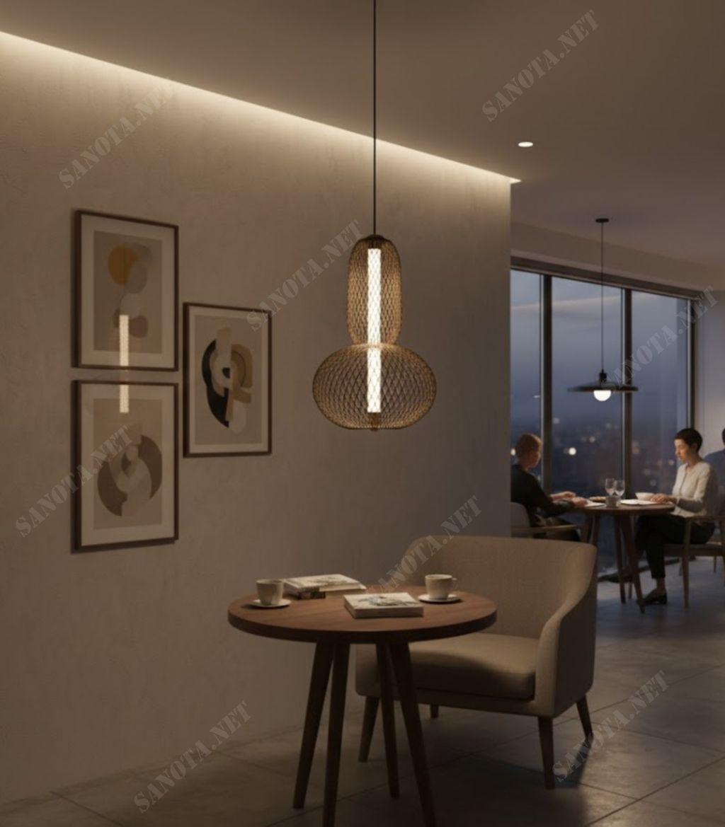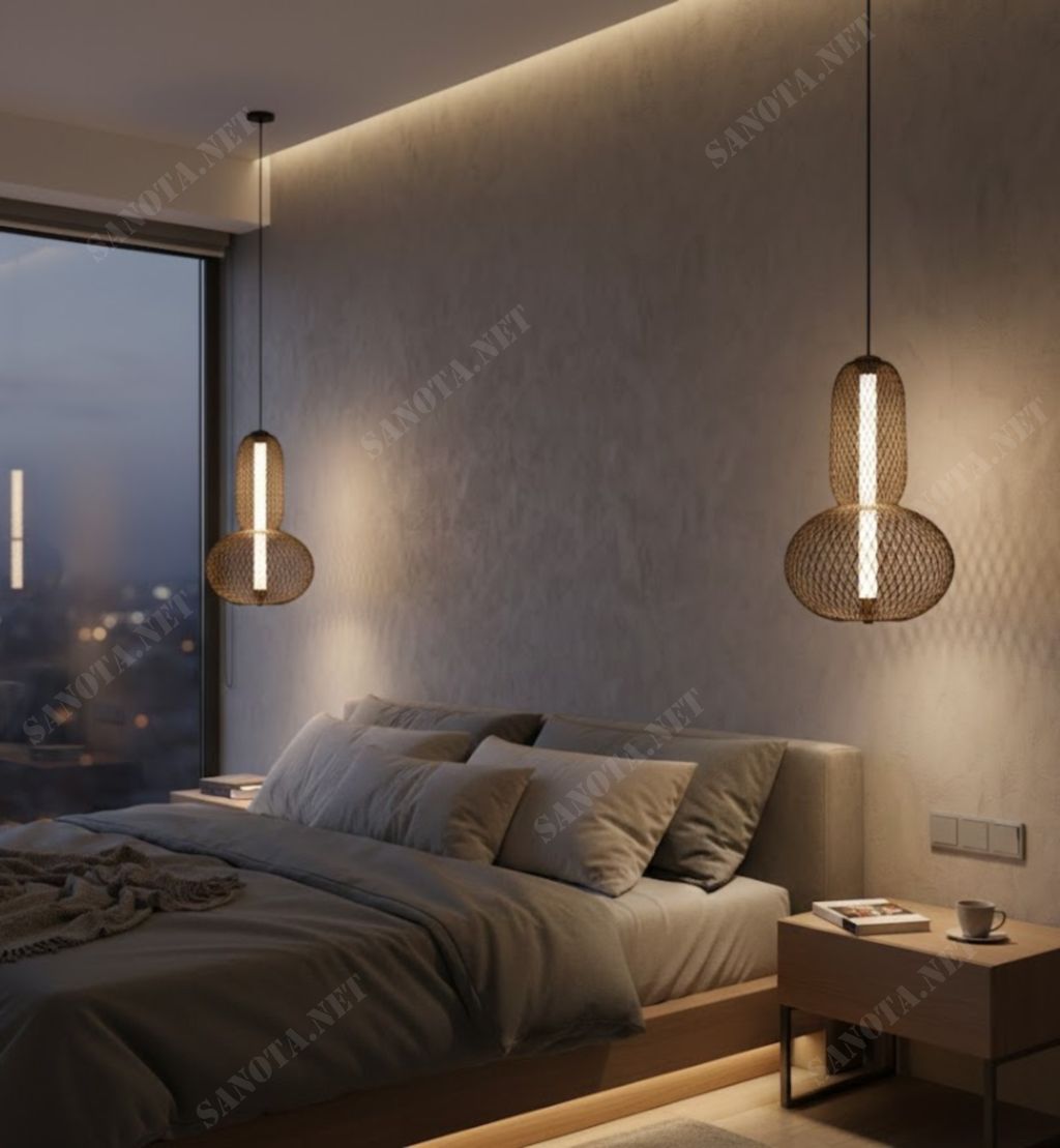 Đèn thả lưới hai tầng hiện đại không chỉ đảm nhiệm chức năng chiếu sáng mà còn đóng vai trò như một chi tiết decor tinh tế. Mẫu đèn giúp không gian trở nên gọn gàng, có chiều sâu và thể hiện rõ gu thẩm mỹ hiện đại, tinh giản nhưng đầy tính nghệ thuật.