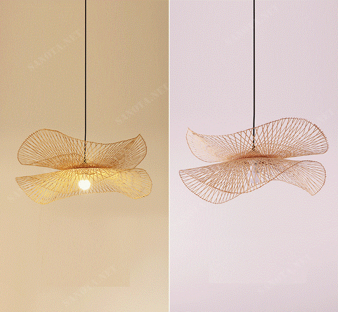 Được tạo ra từ những sợi nan tre được đan tỉ mỉ chặt chẽ. Chiếc đèn thả là một hiện thân của sự kỹ công và tâm huyết của những nghệ nhân làm thủ công. Với hai chiếc lá sen đối xưng, mỗi chi tiết nhỏ nhưng chứa đựng một phần linh hồn và tinh thần của người thợ làm.