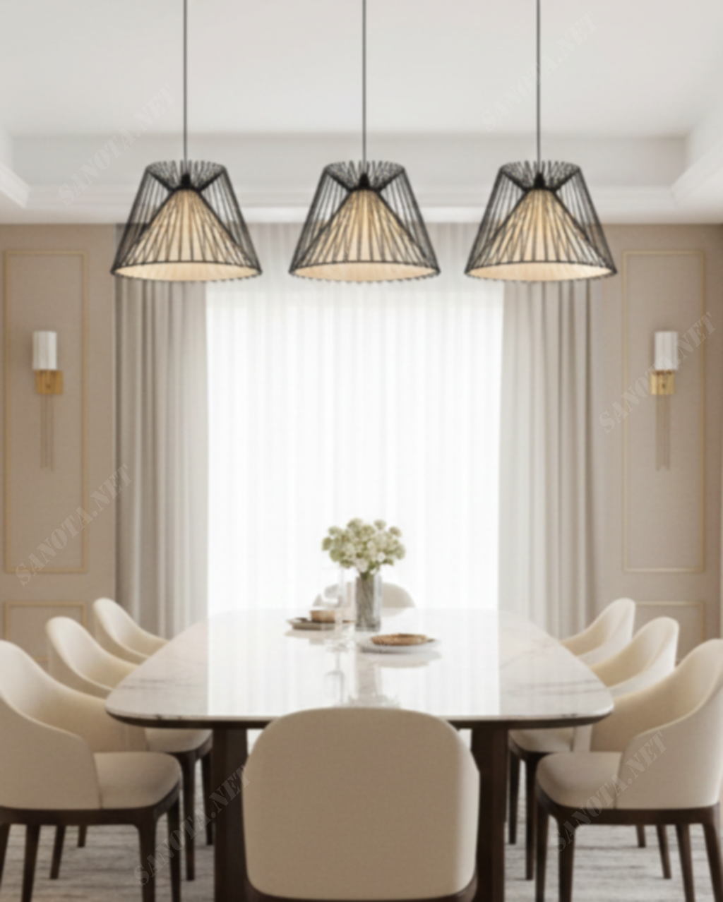 Dây treo mảnh mai nhưng chắc chắn, dễ dàng điều chỉnh độ cao. Bạn có thể sắp xếp bộ ba đèn theo hàng ngang cân đối. Cách bố trí này tạo sự đồng điệu cho khu vực bàn ăn. Vẻ đẹp tối giản giúp xóa tan sự rườm rà cho căn nhà.