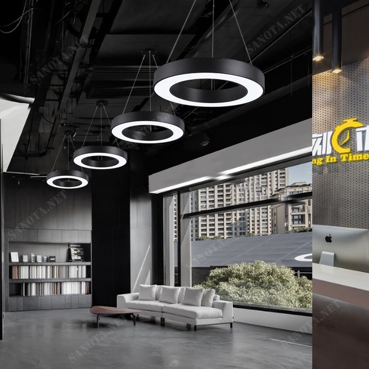 Tấm mica màu trắng đục được sử dụng để che phủ bóng LED, tạo ra một ánh sáng dịu nhẹ nhưng vẫn đủ sáng để chiếu rọi khắp không gian văn phòng. Vòng tròn đều của sản phẩm tạo nên sự đồng nhất và tinh tế, trong khi thân kim loại sơn tĩnh điện màu đen cao cấp mang đến vẻ thẩm mỹ sang trọng và hiện đại cho không gian làm việc. Đèn thả văn phòng hình vòng tròn không chỉ là nguồn ánh sáng mà còn là một điểm nhấn trang trí độc đáo, tạo nên không gian làm việc chuyên nghiệp.