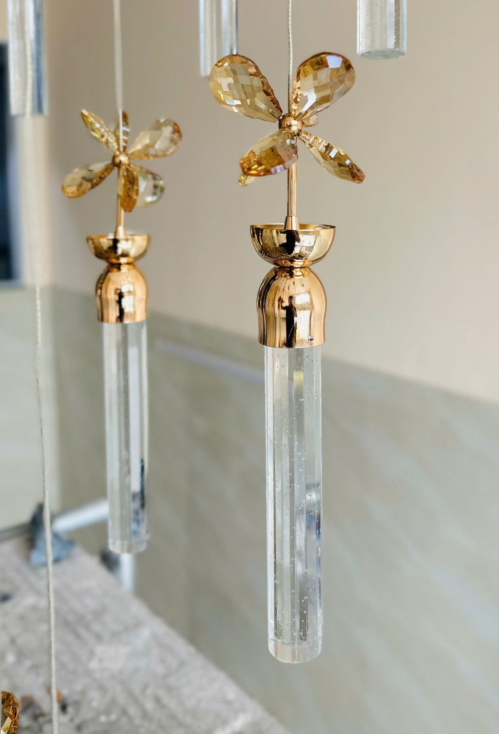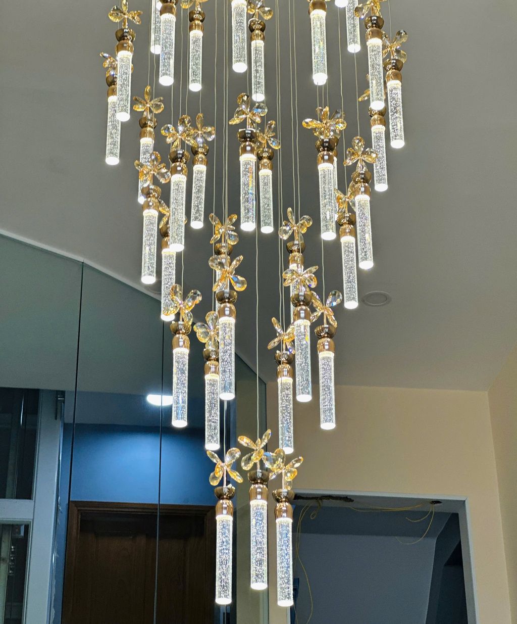 Đèn thông tầng sang trọng được thiết kế với cảm hứng từ vẻ đẹp lấp lánh của những giọt sương sớm. Đèn này sở hữu những thanh pha lê trong suốt, dài thon. Bên trong chứa những hạt thủy tinh li ti phản chiếu ánh sáng lung linh. Mỗi thanh đèn được điểm xuyết bằng họa tiết cánh hoa mạ vàng sang trọng. Tạo nên một tổng thể vừa mềm mại, vừa rực rỡ, tựa như một vườn hoa pha lê đang nở rộ giữa không gian.