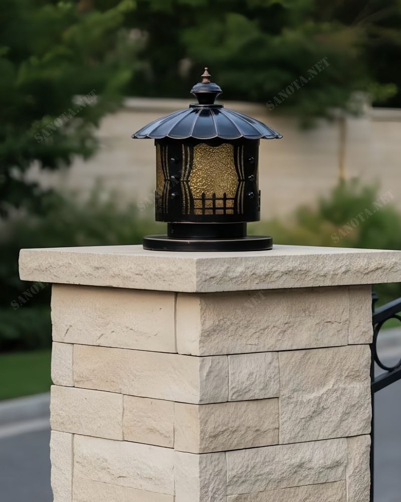 Đèn trụ cổng nổi bật với thiết kế cầu kỳ, lấy cảm hứng từ kiến trúc cung đình. Cấu trúc đèn bao gồm phần đế và thân trụ hình tròn chắc chắn. Điểm nhấn là phần mái xếp lớp, tạo độ sâu và sự vững chãi cho đèn. Đồng thời bảo vệ tốt khỏi các yếu tố thời tiết ngoài trời.