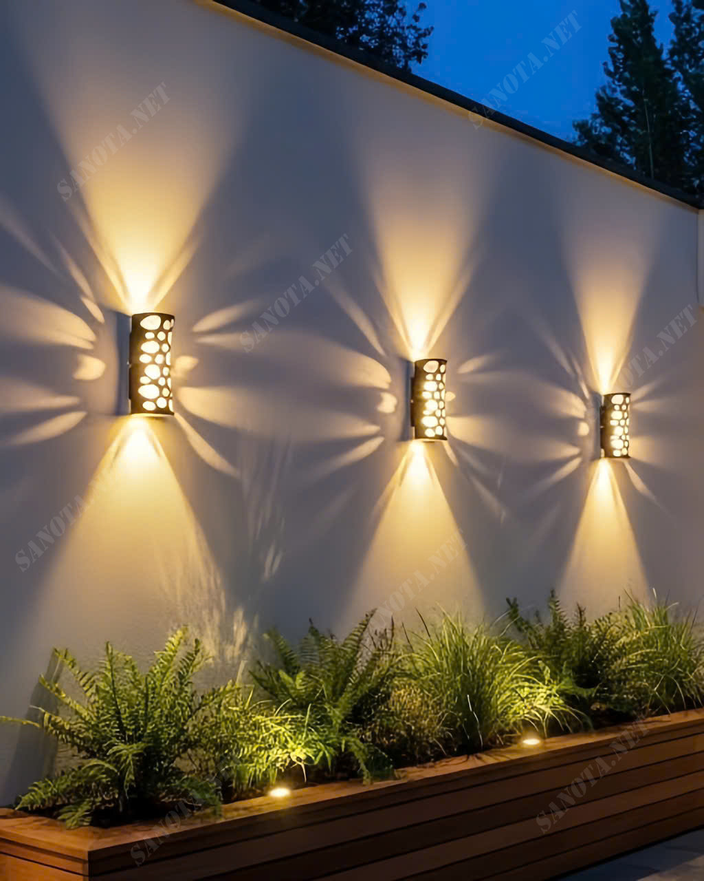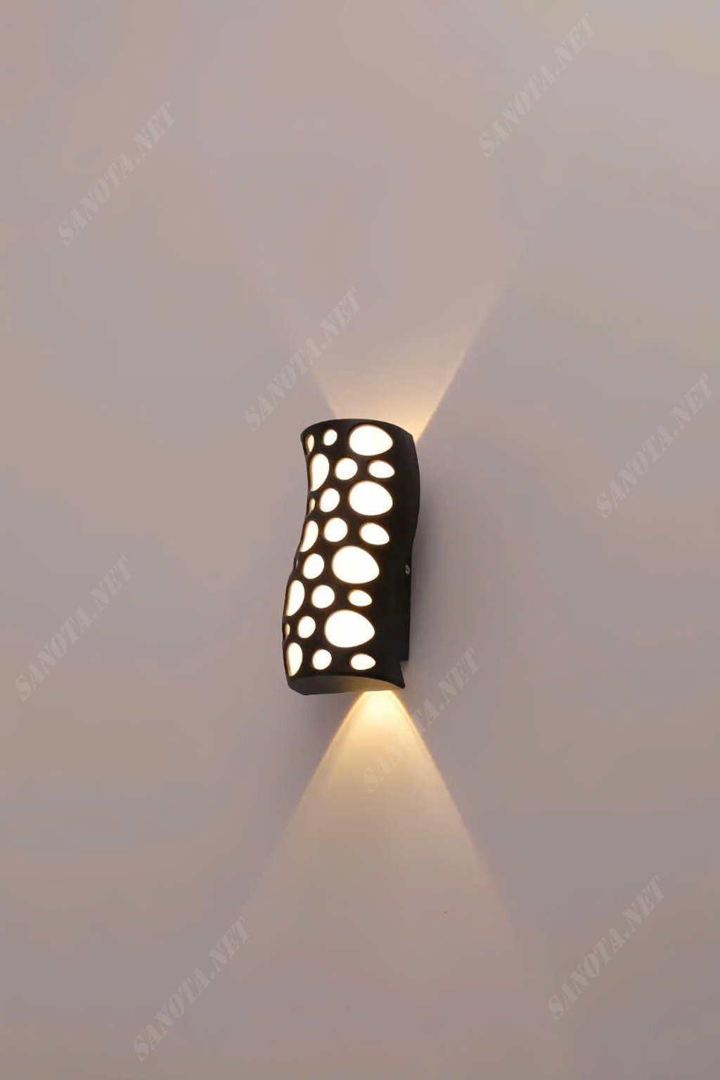 Hiệu Ứng Ánh Sáng Kép Sáng Tạo: Đèn cung cấp ánh sáng hắt lên và hắt xuống (2 chiều), tạo thành hai luồng sáng mềm mại. Đồng thời, ánh sáng còn xuyên qua các lỗ khoét trên thân, tạo ra vô số điểm sáng lấp lánh trên tường, làm cho không gian thêm phần lãng mạn và sinh động.