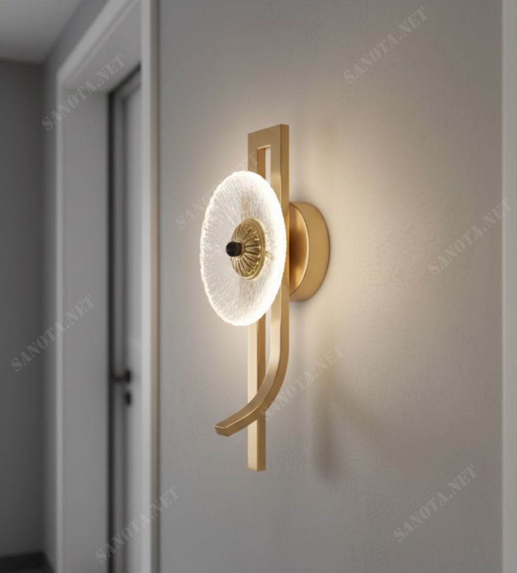 Khung đèn kim loại mạ vàng được thiết kế theo các đường lượn thanh mảnh, vừa tối giản vừa nghệ thuật. Khoảng hở âm – dương trong bố cục tạo sự cân bằng nhịp nhàng. Cho cảm giác như một bức tranh ánh sáng thổi hồn vào bức tường vốn tĩnh lặng.