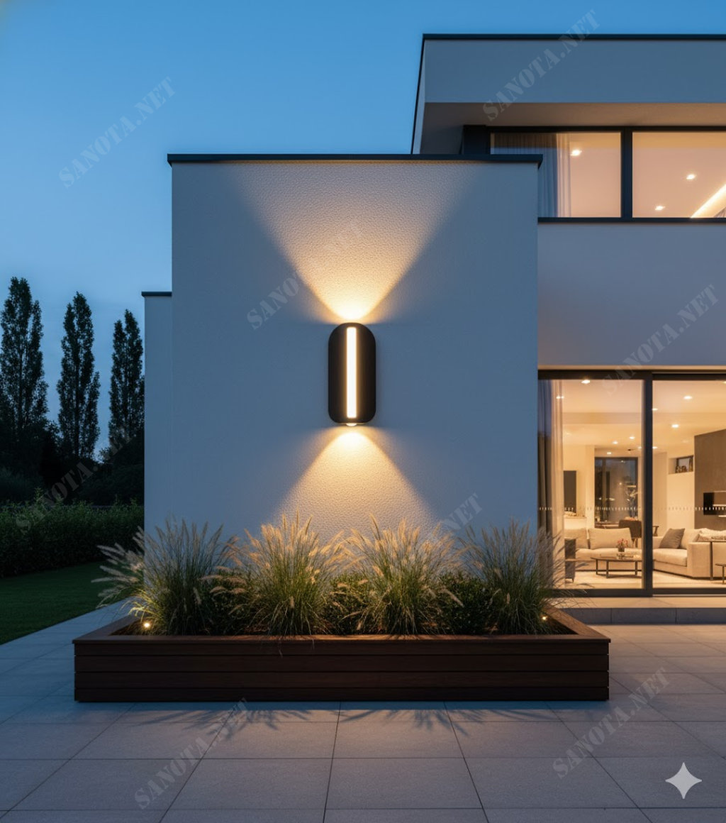Ánh sáng LED 2 chiều hắt lên và hắt xuống nhẹ nhàng, lan tỏa đều, tạo hiệu ứng ánh sáng ấm áp 3000K, vừa giúp chiếu sáng vừa tôn lên vẻ đẹp của bức tường và kiến trúc xung quanh.