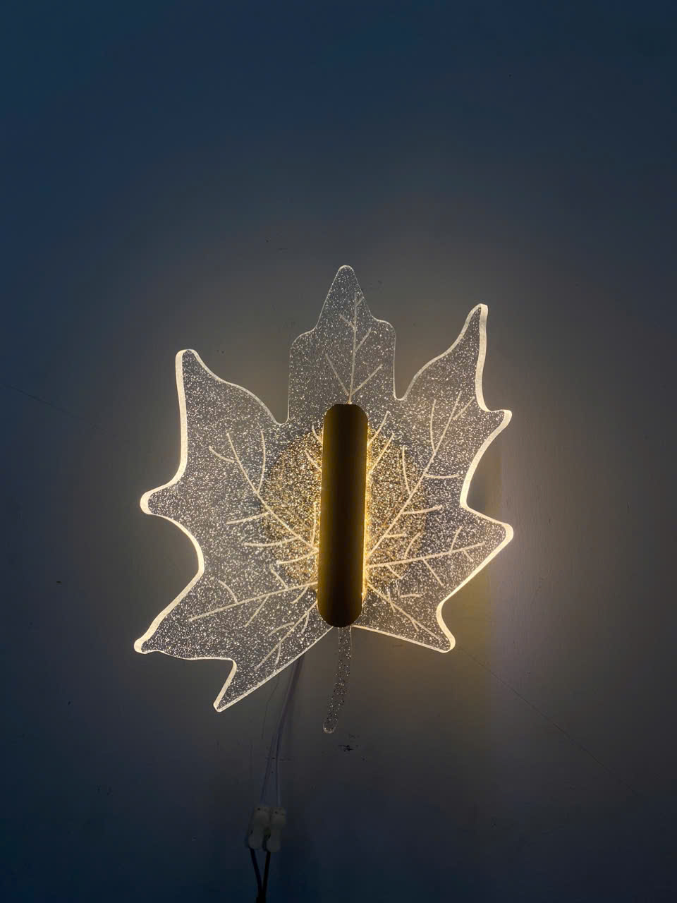 Mẫu đèn tường hình chiếc lá mang vẻ đẹp tinh tế và nhẹ nhàng, rất phù hợp với phong cách Bắc Âu (Scandinavian). Thiết kế chiếc lá cách điệu từ chất liệu mica mờ. Kết hợp phần thân kim loại ánh vàng tạo nên điểm nhấn vừa hiện đại vừa gần gũi với thiên nhiên. Ánh sáng dịu nhẹ được khuếch tán qua các đường gân lá mảnh mai. Tạo hiệu ứng ánh sáng nghệ thuật và mềm mại trên bề mặt tường.