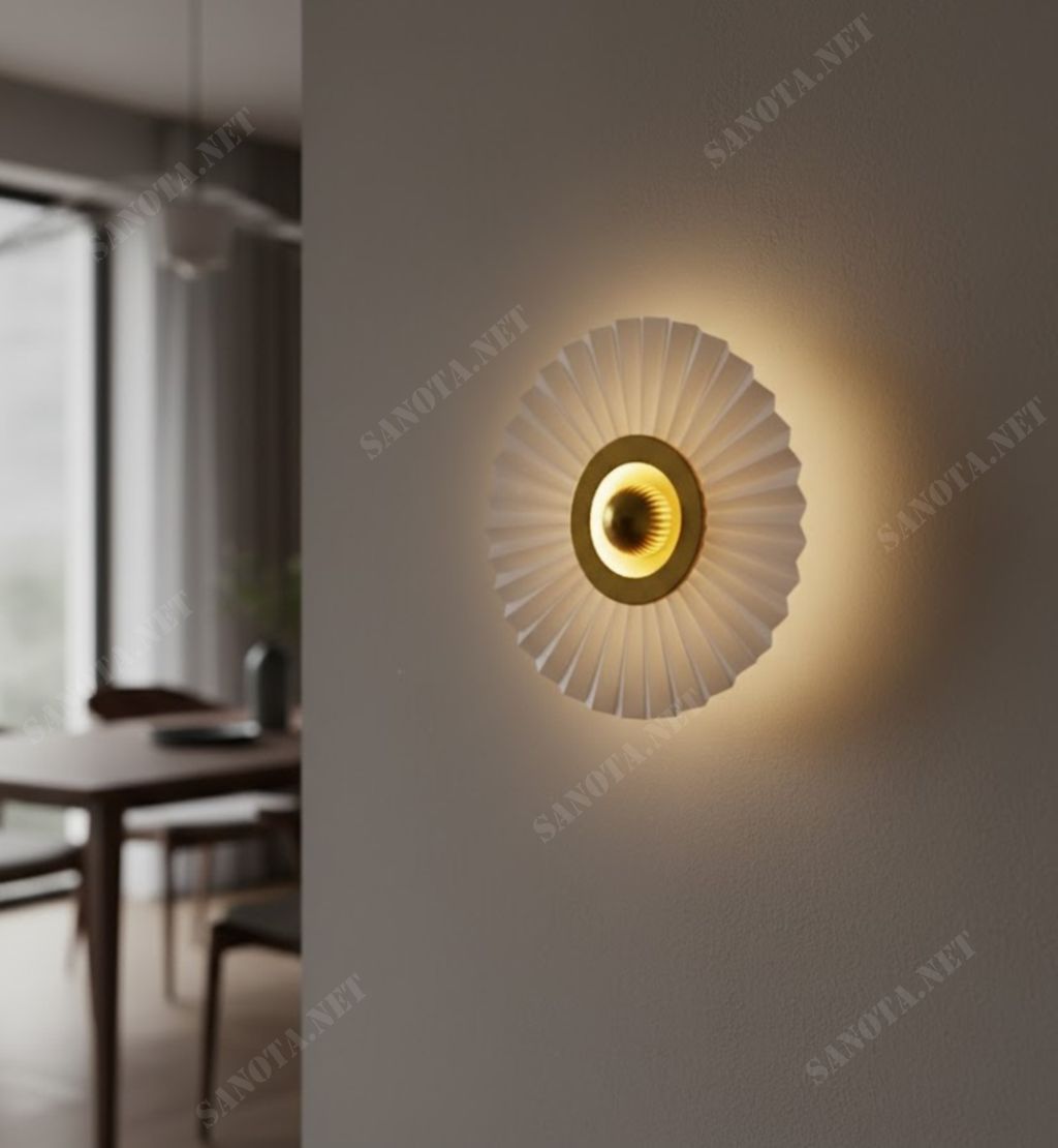 Chiếc đèn tường hình tròn gấp nếp ấn tượng với thiết kế mặt tròn gấp nếp đều nhau như cánh quạt. Tạo hiệu ứng ánh sáng loang tỏa độc đáo khi bật sáng. Từng nếp gấp tạo nên chiều sâu thị giác, khiến bức tường trở nên sinh động và đầy sức hút.