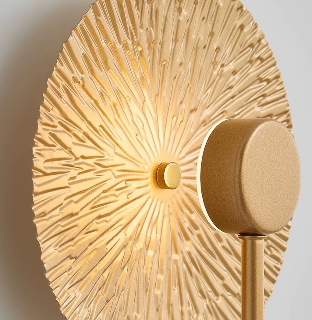 Sở hữu thiết kế hiện đại pha lẫn hơi thở nghệ thuật, đèn tường sang trọng gây ấn tượng với mặt đèn hình tròn như ánh mặt trời rực rỡ, kết hợp cùng họa tiết vân nổi độc đáo lan tỏa ánh sáng nhẹ nhàng. Tone vàng ánh kim nổi bật, sang trọng. Biến không gian trở nên ấm cúng, đẳng cấp và đầy cảm hứng.