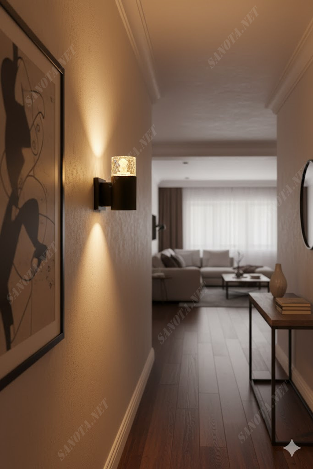 Đèn tường pha lê mang thiết kế hiện đại, thanh lịch với ánh sáng chiếu hai hướng lên và xuống, tạo hiệu ứng ánh sáng ấn tượng và sang trọng cho mọi không gian. Sự kết hợp giữa thân đèn hợp kim sơn tĩnh điện màu đen nhám cùng chụp pha lê cắt kim cương giúp sản phẩm vừa bền bỉ vừa mang giá trị thẩm mỹ cao.