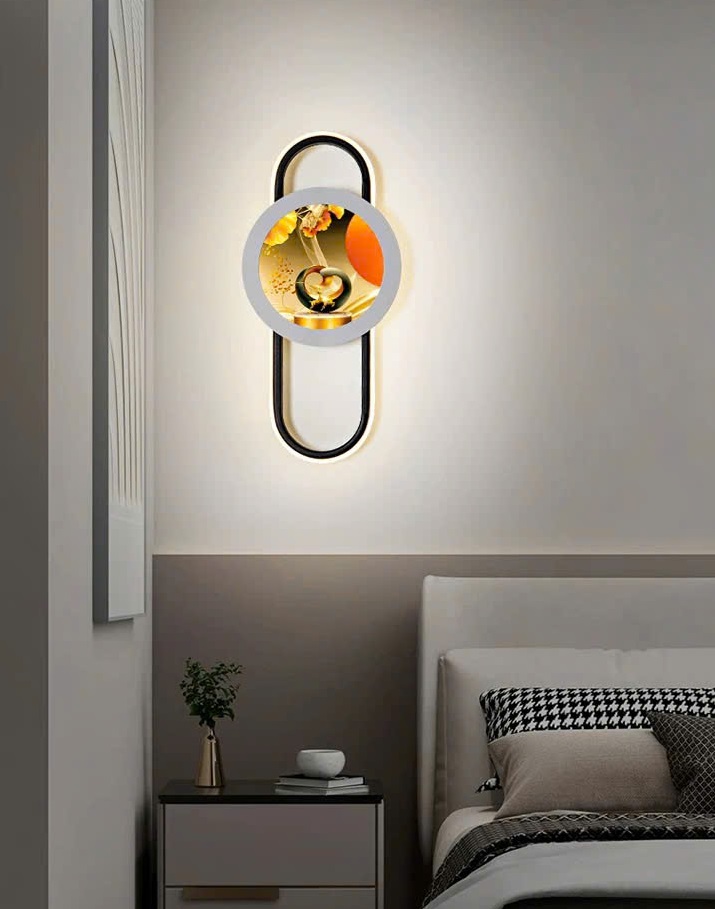 Đèn tường trang trí được thiết kế theo kiểu dáng hình oval phá cách, nổi bật với vòng tròn trung tâm kết hợp tranh nghệ thuật trừu tượng, lấy cảm hứng từ thiên nhiên và đường nét hình học hiện đại. Sự kết hợp hài hòa giữa ánh sáng LED vàng dịu nhẹ và hình ảnh trung tâm không chỉ giúp tạo điểm nhấn thị giác mà còn mang đến cảm giác ấm áp, dễ chịu, lý tưởng cho phòng ngủ, phòng khách hay hành lang.