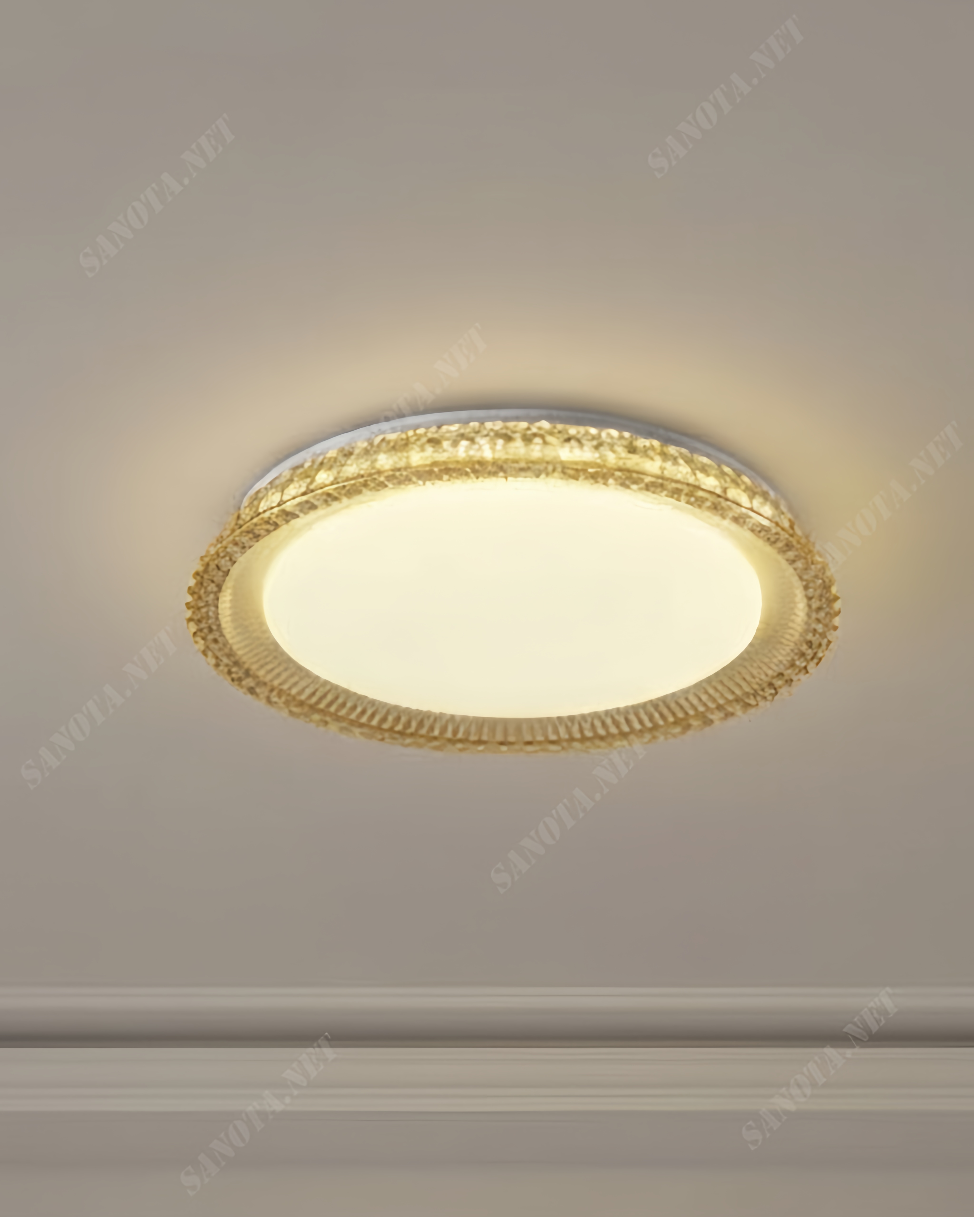 Điểm nhấn nằm ở khung viền mạ vàng cao cấp cùng vỏ đèn chạm khắc tinh xảo. Những hoa văn lấp lánh như pha lê tạo nên vẻ đẹp lộng lẫy và trong trẻo. Thiết kế hình tròn mang ý nghĩa phong thủy trọn vẹn, giúp hài hòa kiến trúc căn phòng. Kiểu dáng ốp trần gọn gàng giúp tối ưu không gian cho các căn hộ trần thấp.
