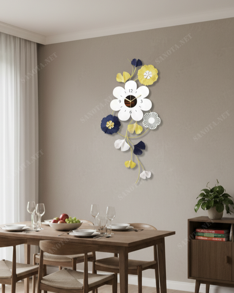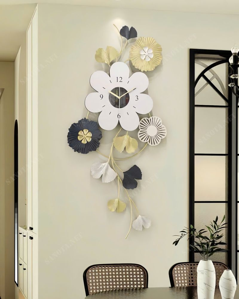 Đồng hồ nghệ thuật là một tác phẩm trang trí tinh tế, mang lại điểm nhấn tươi mới và đầy sức sống cho không gian nội thất của bạn. Với thiết kế độc đáo mô phỏng dây hoa uyển chuyển, chiếc đồng hồ không chỉ là công cụ xem giờ mà còn là bức tranh nghệ thuật ba chiều đầy cảm hứng. Sự kết hợp màu sắc trang nhã giữa vàng, trắng và xanh navy tạo nên vẻ đẹp sang trọng, hiện đại và rất cuốn hút.