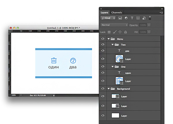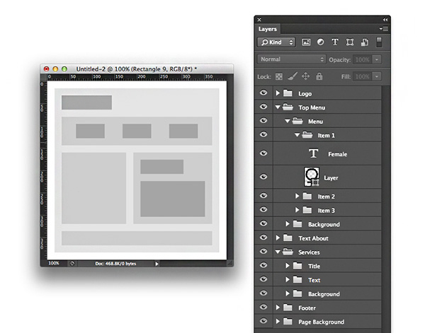 Ví dụ, khi bạn làm web design, bạn làm một button bao gồm nút và chữ trên nó. Chúng nên được gom lại thành 1 folder tên Button. Một menu bao gồm nhiều Button sẽ được gom lại thành nhóm folder Menu. Một background được tạo bởi nhiều lớp layer ghép lại cũng nên được gom lại thành một nhóm folder tên Background.
